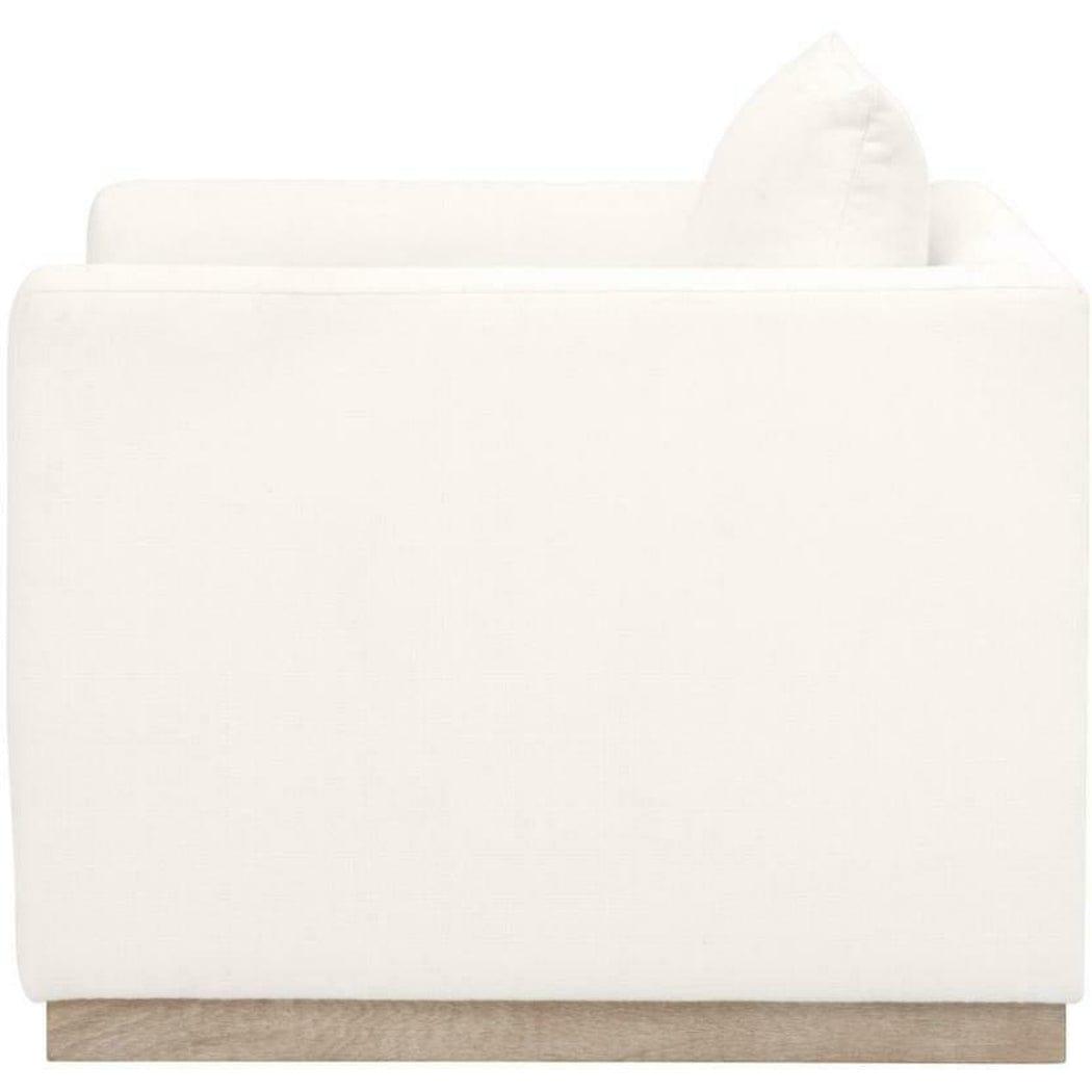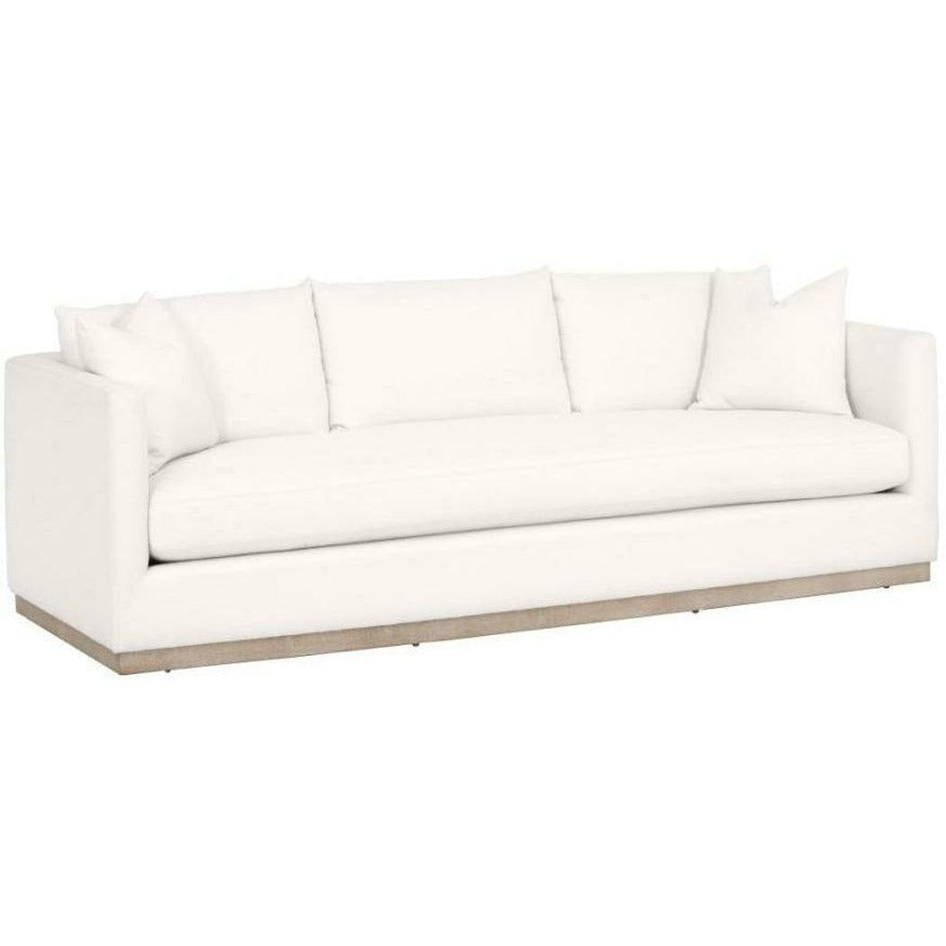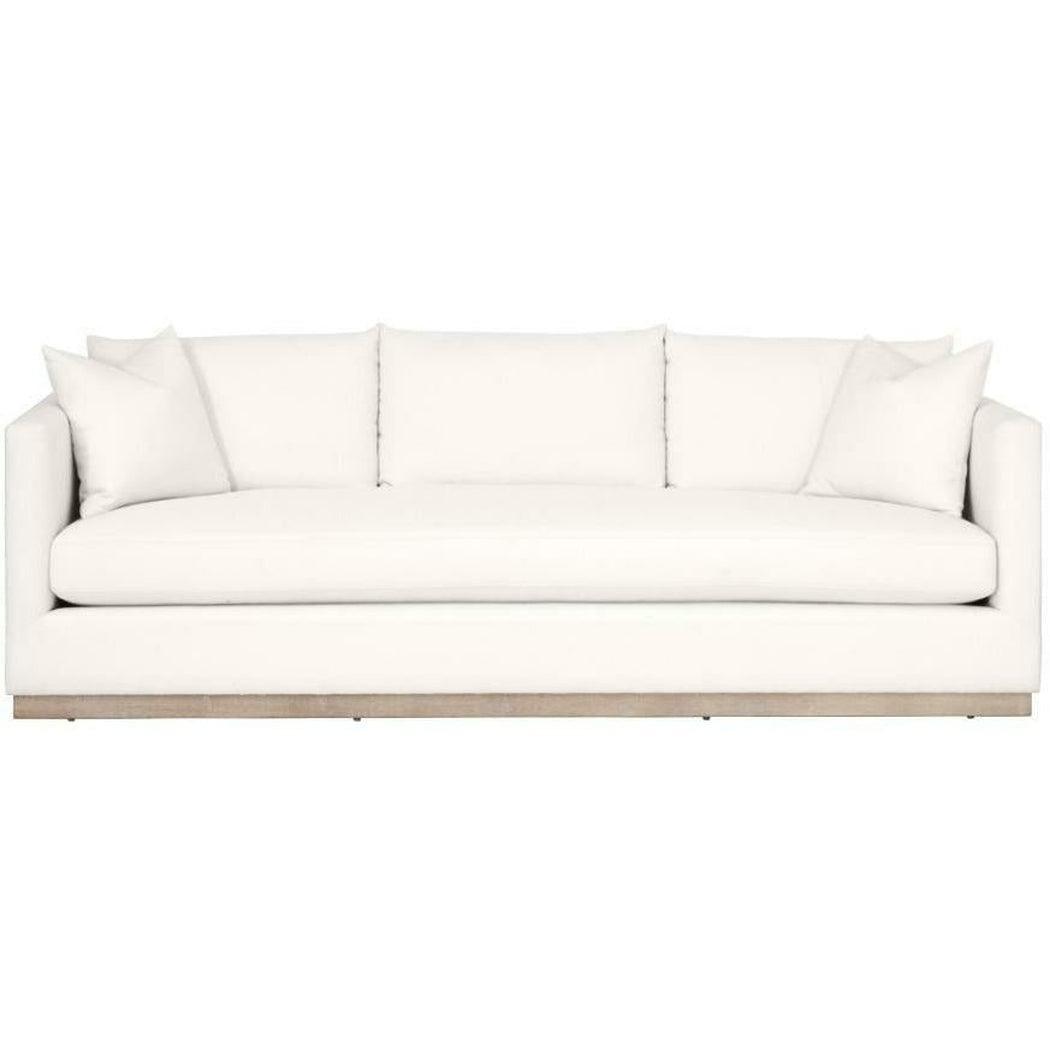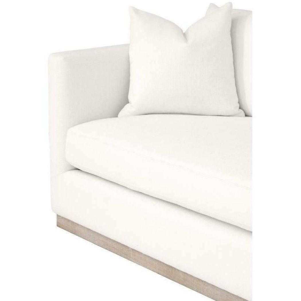 Experience the epitome of luxury with the Siena 96" Plinth Base Sofa. Its modern design, sleek lines, and exposed wood base exude sophistication, elevating any transitional living space. Sink into the lush ivory upholstery, crafted with a high-quality performance fabric that is both easy to clean and care for. The perfect blend of down and polyester in the cushions provides unparalleled comfort and support. Not only is this sofa visually appealing, but it also offers a luxurious spot to unwind. Its neutral color palette and modern aesthetics, including sleek lines and an exposed wood base, make it a perfect addition to any transitional-style living space. Indulge in the ultimate comfort and style with the Siena 96" Plinth Base Sofa, a masterpiece of high-quality materials and elegant design.