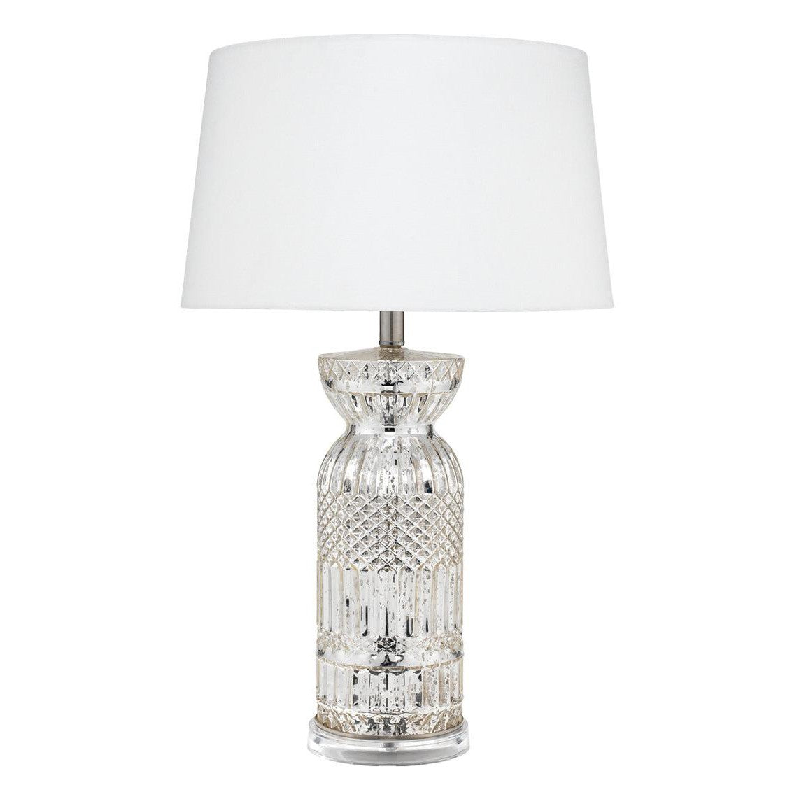 The Silver Glass Acrylic Isla Table Lamp is a perfect blend of elegance and traditional design. Its contemporary pattern adds a stylish touch to any room, while the sturdy clear acrylic base ensures a strong foundation. With an antique mercury glass finish, this lamp will effortlessly elevate the aesthetics of your space. The Isla antique mercury glass table lamp is an elegantly patterned contemporary lamp with a Traditional aesthetic resting on a clear acrylic base Elegance meets traditional design with the Isla antique mercury glass table lamp. The contemporary pattern adds a touch of style to any room and the clear acrylic base provides a sturdy foundation.