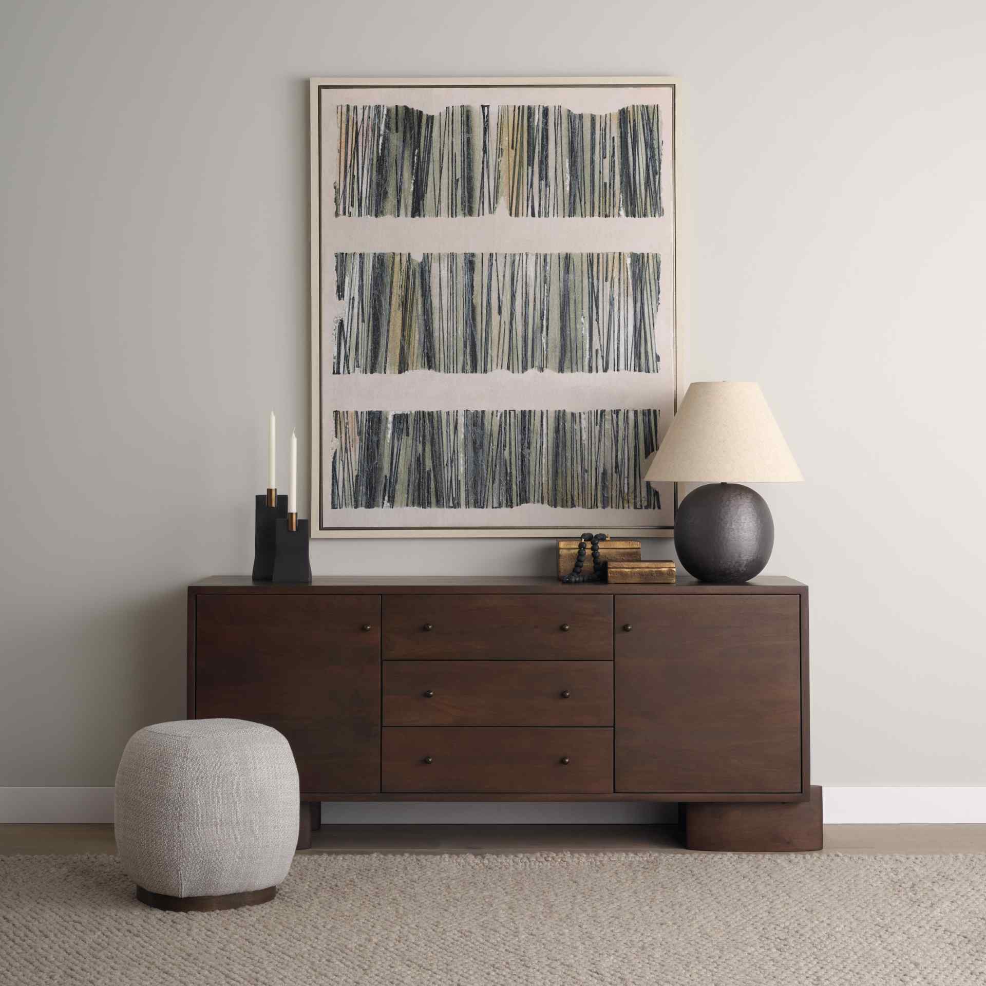 - Enveloped in sophisticated oatmeal fabric and supported by a solid hackberry base.