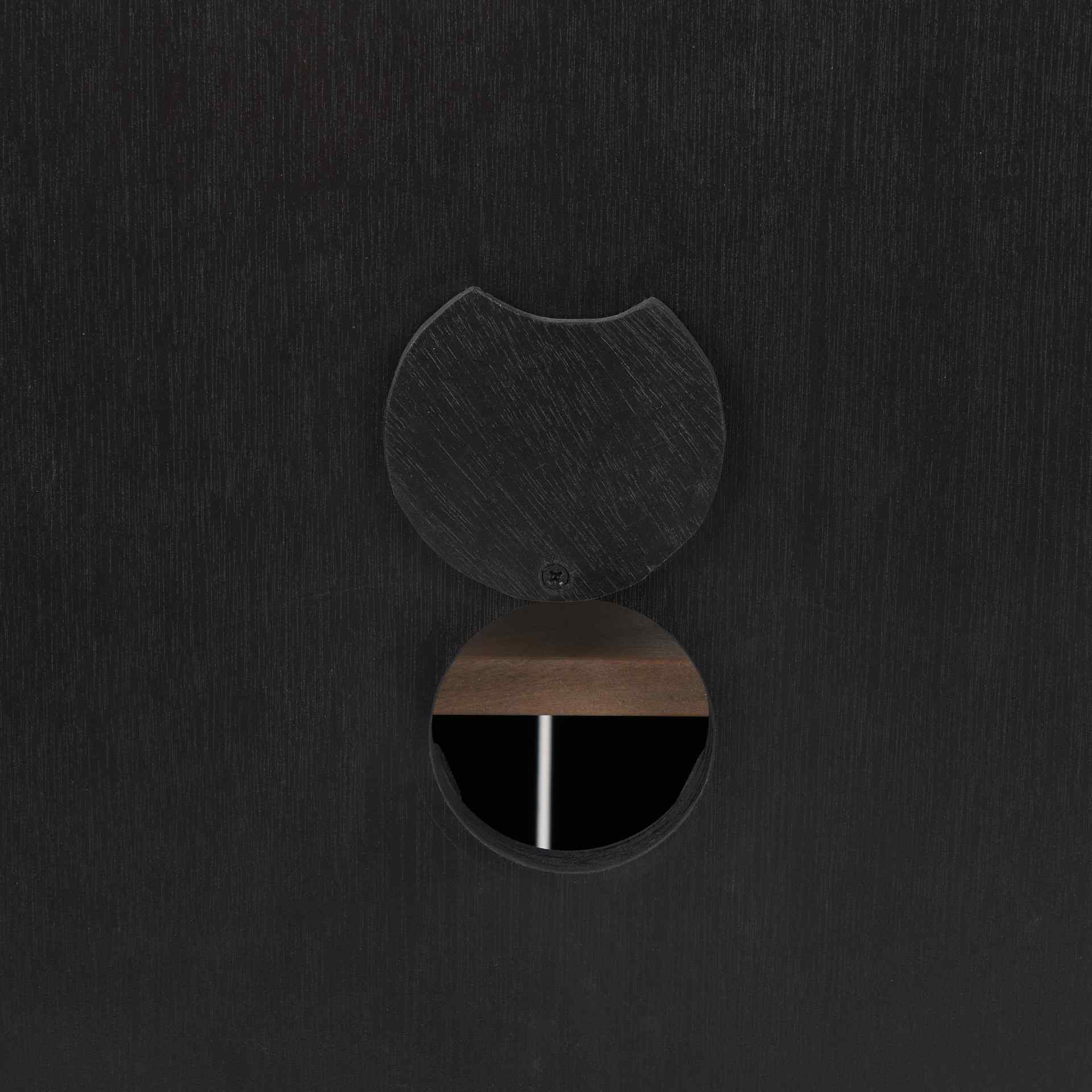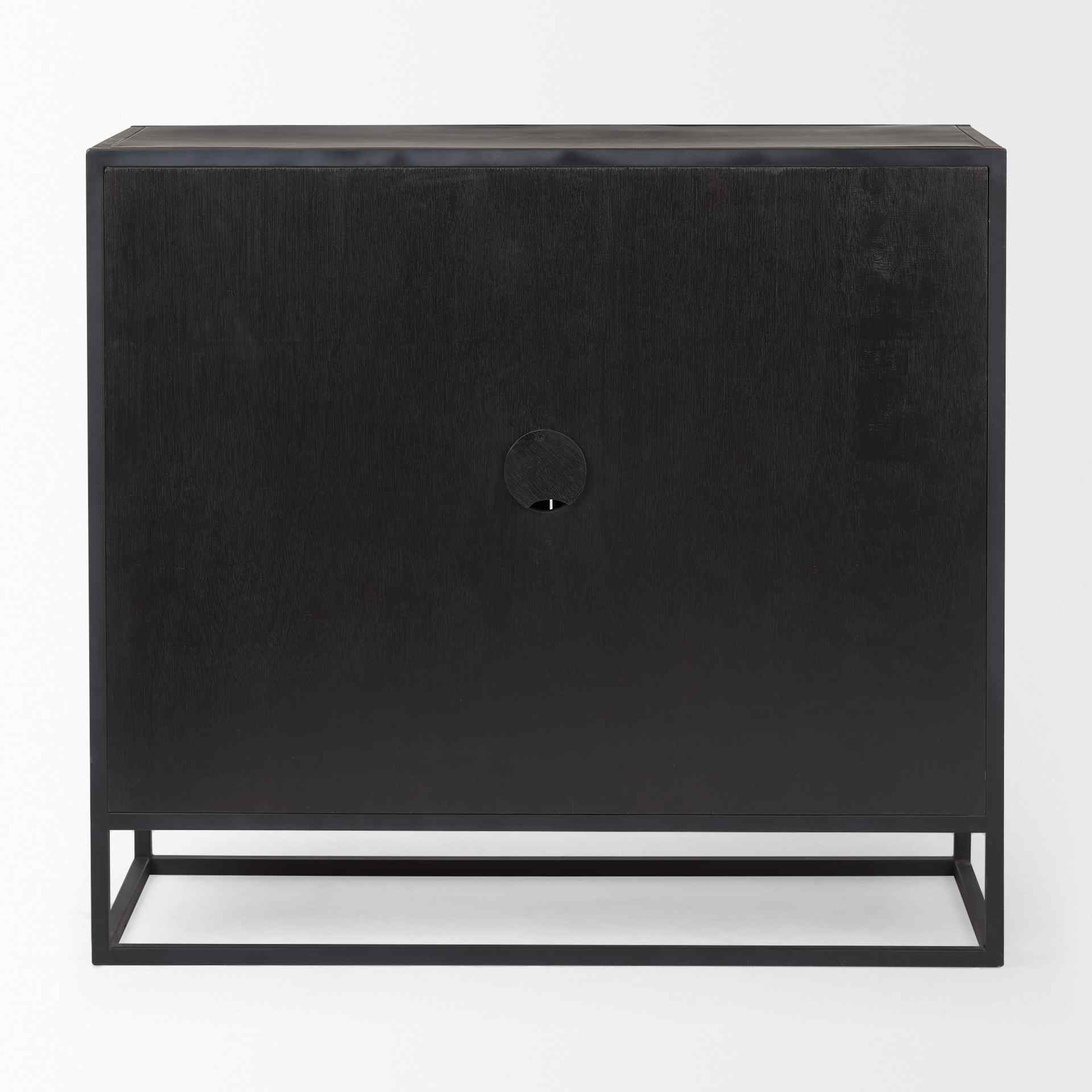 The Sloan Wood Black Accent Cabinet with Glass Doors is a striking addition to any home. Its design fits well in modern farmhouse, industrial, or urban loft settings. Crafted from sturdy black iron, the cabinet rests on a sleek iron base, offering a robust build. Dark, solid mango wood doors add a touch of elegance, featuring a sleek grip and tempered glass panels. These glass doors provide a view into the lighter solid wood interior, adding a layer of sophistication to its design.