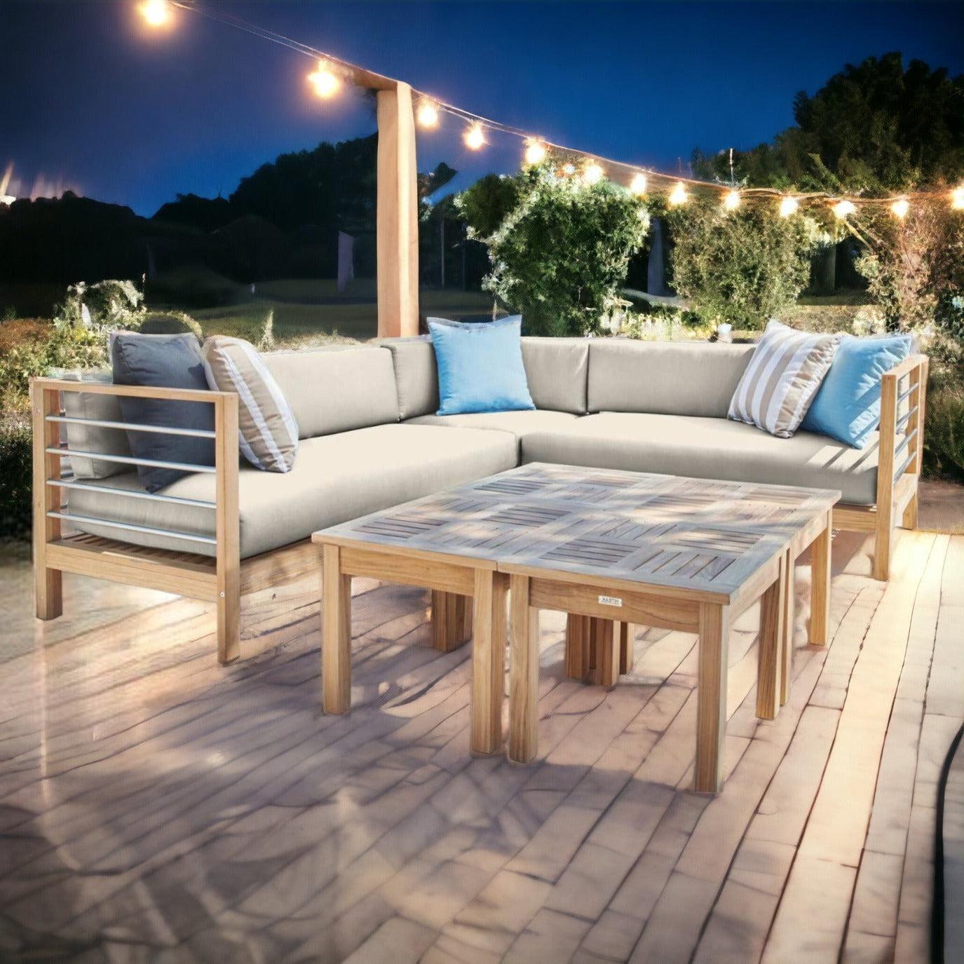 Each piece is crafted from responsibly harvested teak wood, ensuring an eco-friendly choice for your patio. The cushions are made with Sunbrellafabric, known for its weather resistance, making them ideal for outdoor use. The hand-sanded finish of the teak starts as a light golden color and, adding character to your outdoor setup. The marine-grade stainless steel hardware ensures longevity and resistance against rust, even in harsh weather conditions.