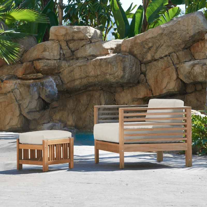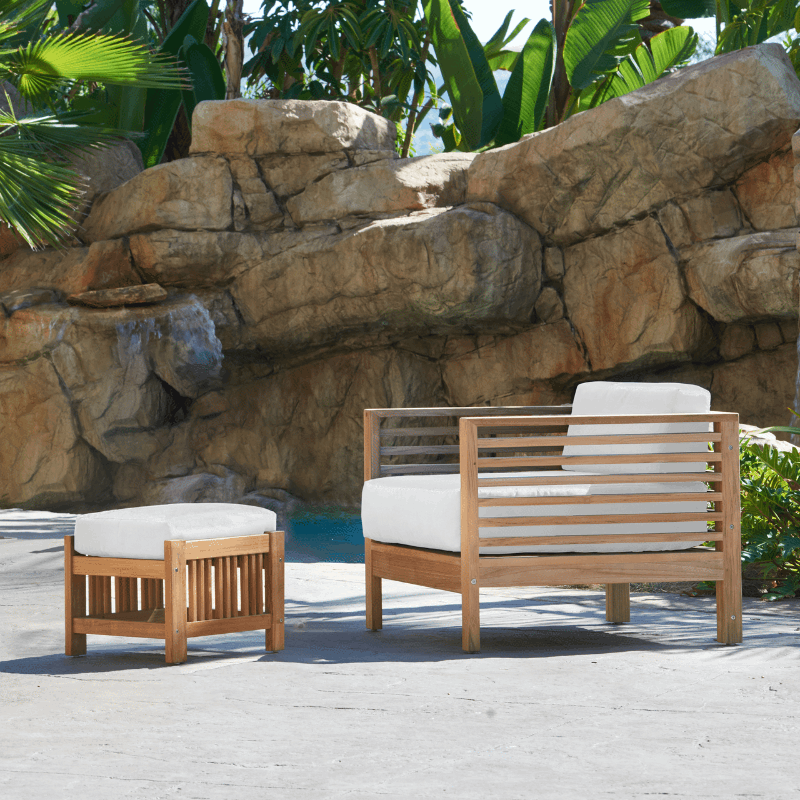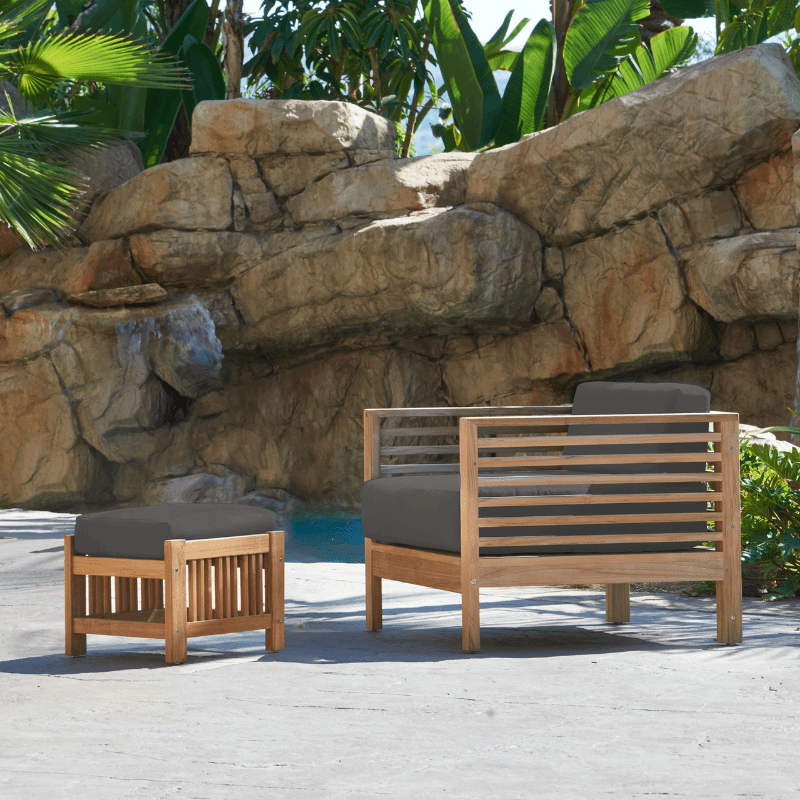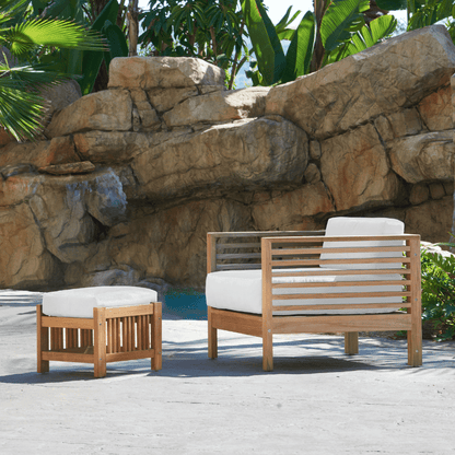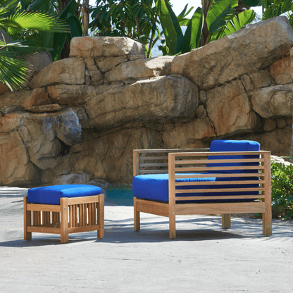 Included in this set is a comfortable club chair and a matching ottoman, both designed to provide a relaxing experience. The cushions, made from all-weather Sunbrella fabric, resist fading and are easy to maintain, enhancing the set's practicality. The teak used is responsibly sourced from well-managed plantations, kiln-dried to prevent cracking or shrinking. Marine-grade stainless steel hardware ensures rust resistance, adding to the set's longevity. While natural wood grain variations and small surface cracks may appear over time, these do not affect the set's structural integrity.