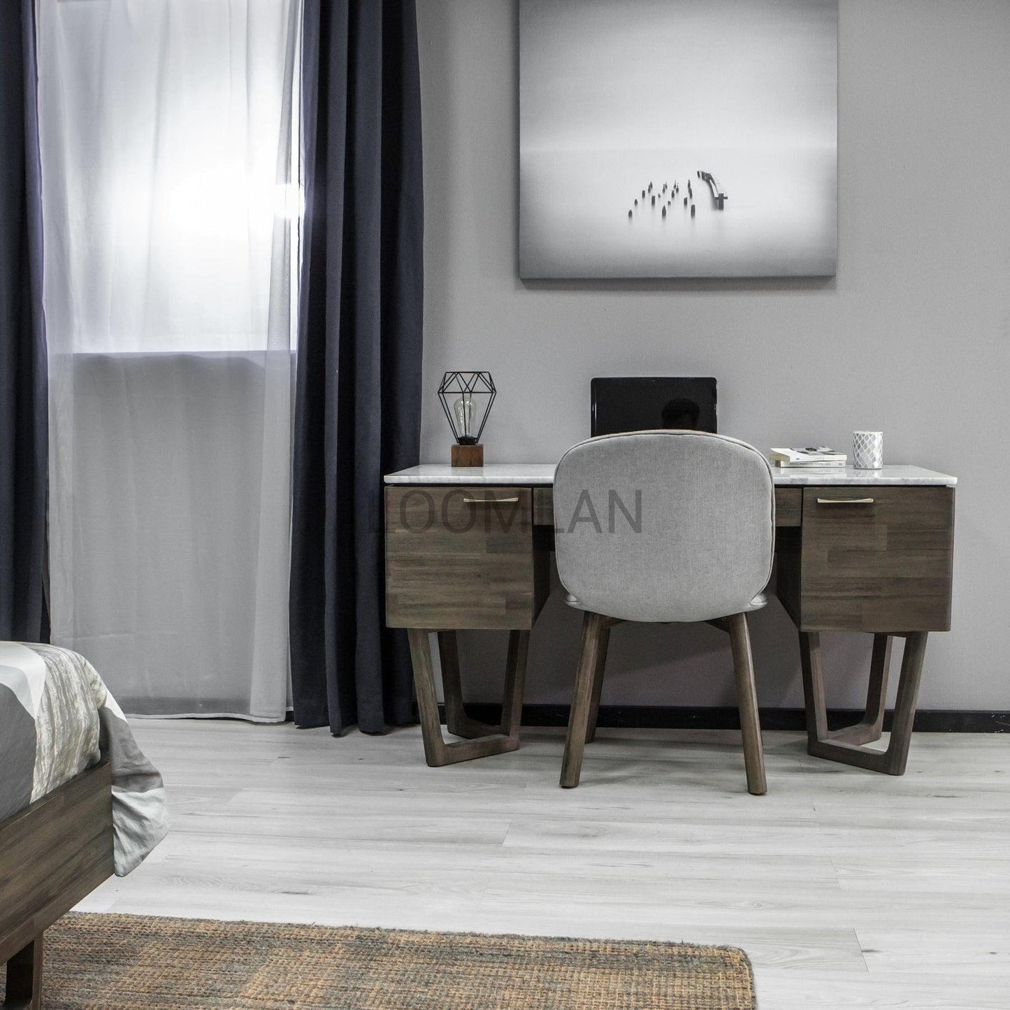 Elevate your workspace with our Solid Wood and Marble Mid-Century Desk. Designed for risk-takers, this versatile desk boasts an Italian Carrara Marble top, a solid acacia frame, and a unique V-shaped base that will inspire you to think outside the box. A perfect blend of function and style for any modern, bold interior.