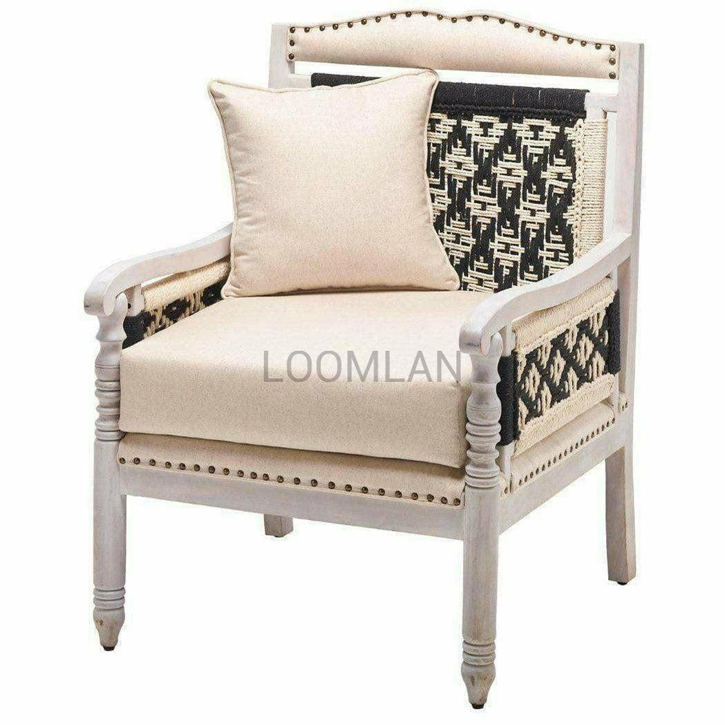 This Beautiful Solid Wood White Wash Base Rope Woven Upholstered Accent Chair Cream Features