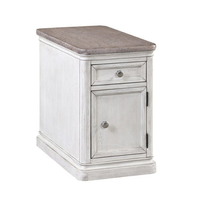 The Sonoma Chairside Table brings a touch of classic charm to any room. With its two-tone weathered finish, this table offers a mix of wire-brushed grey and antique white, adding a sophisticated touch to a casual setting. This table's design features soft rounded corners and simple molded doors and drawers, embodying the cottage and bungalow style. Its tapered turned feet contribute to its graceful appearance, making it a versatile piece that fits well in any environment.
