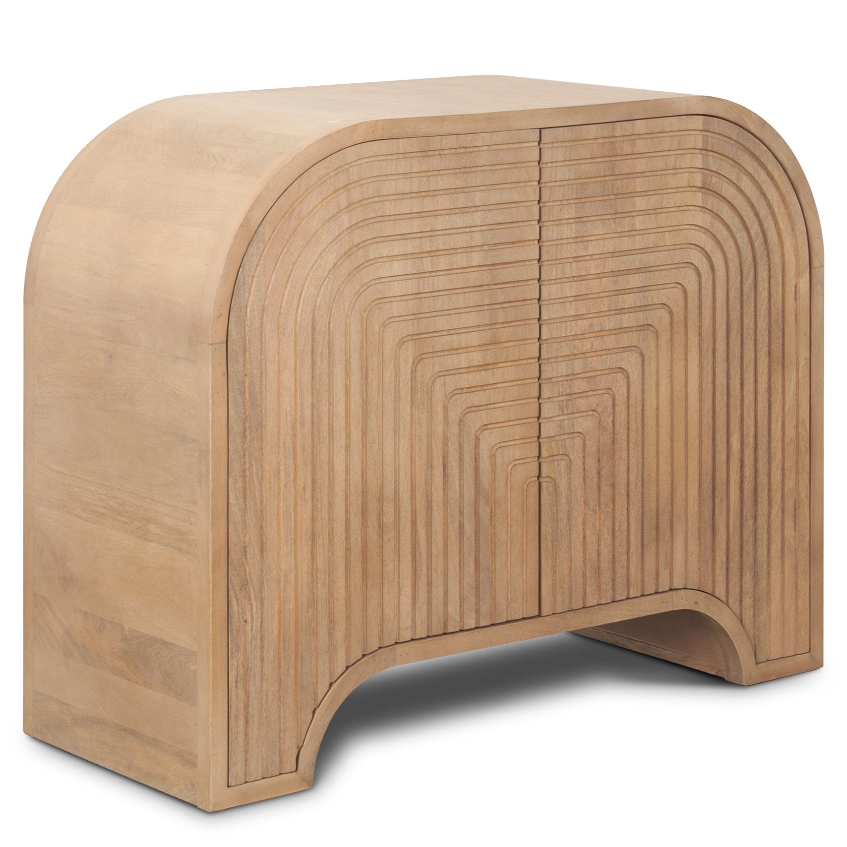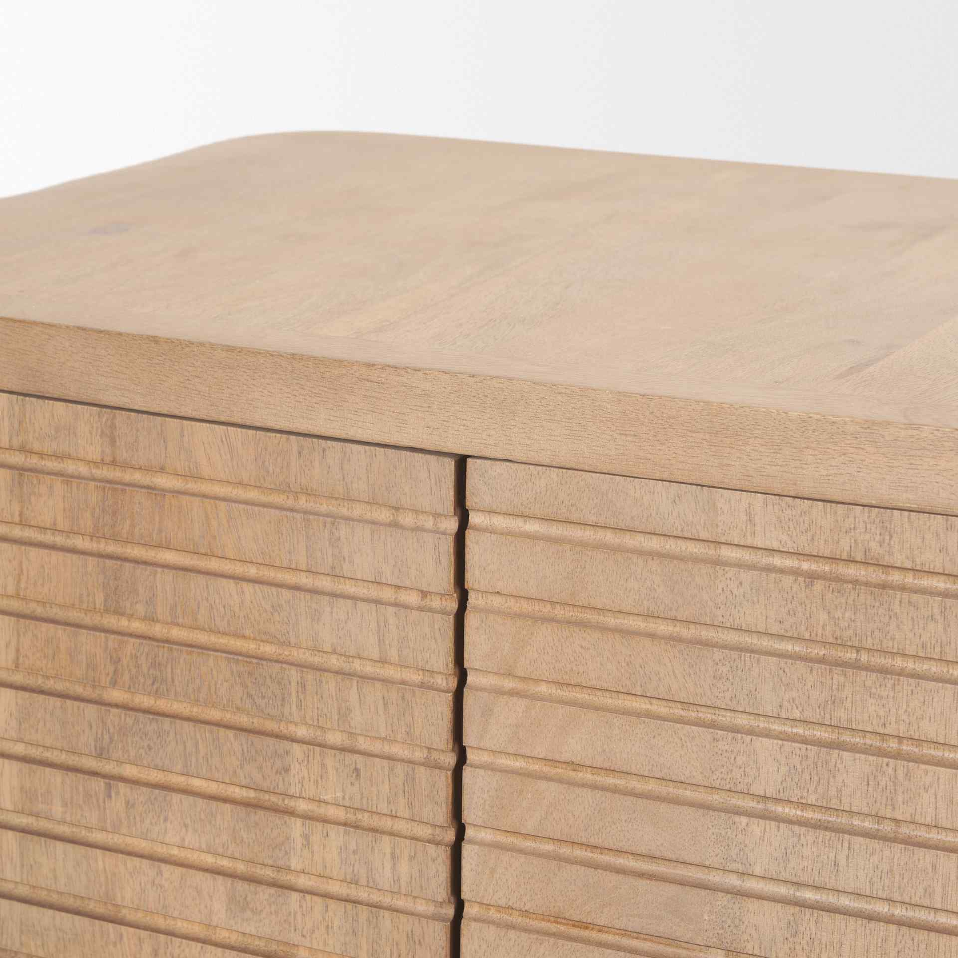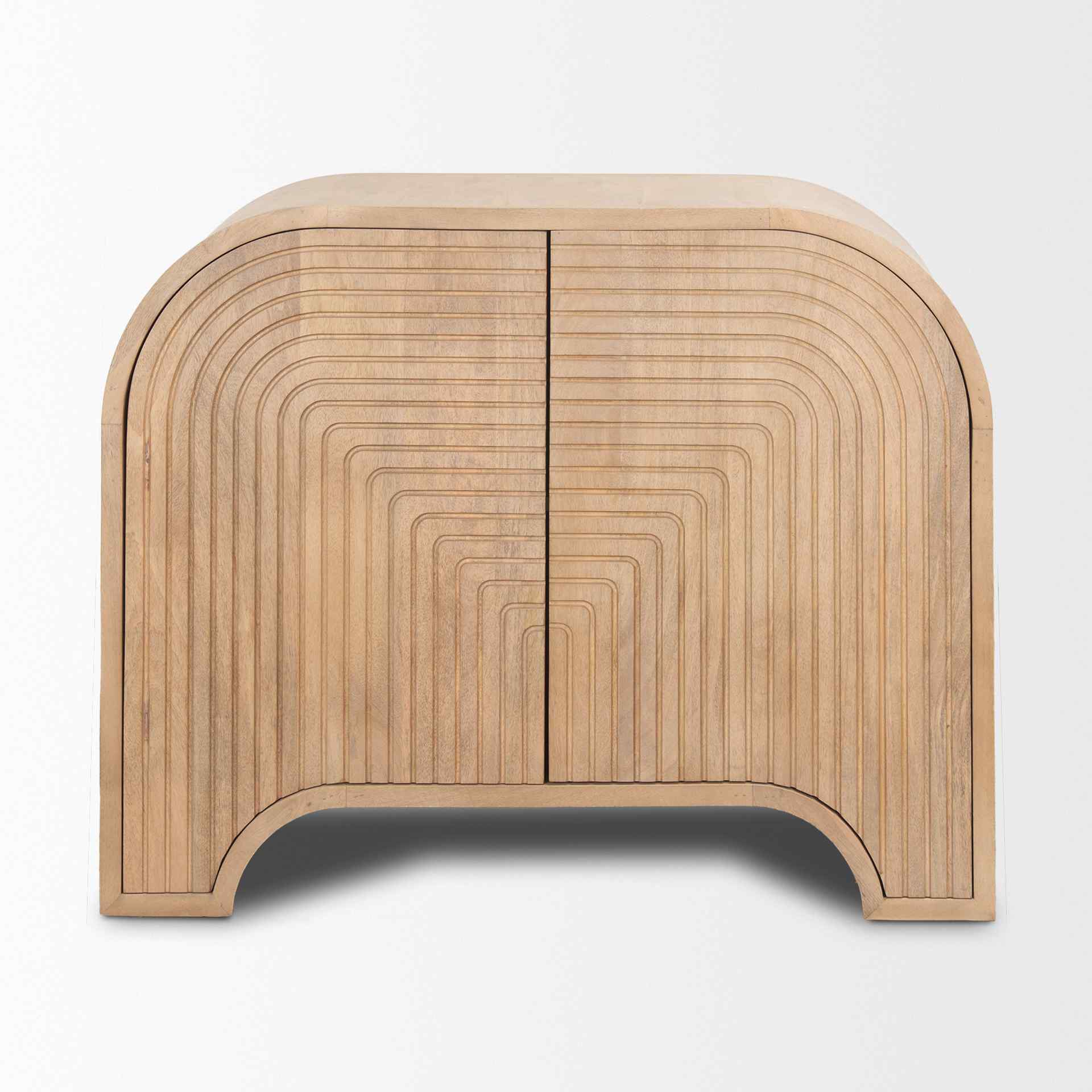 The Sorina Light Brown Wood Accent Cabinet is designed to elevate the aesthetic of any room with its blend of modern style and natural elegance. Crafted from solid mango wood, this cabinet boasts a light brown finish that enhances the natural beauty of the wood. Its standout feature is the unique reverse-fluted CNC doors, which add depth and texture to the piece. The doors integrate recessed handles seamlessly into the intricate fluted pattern, ensuring a smooth, uninterrupted surface that is both functional and visually striking.
