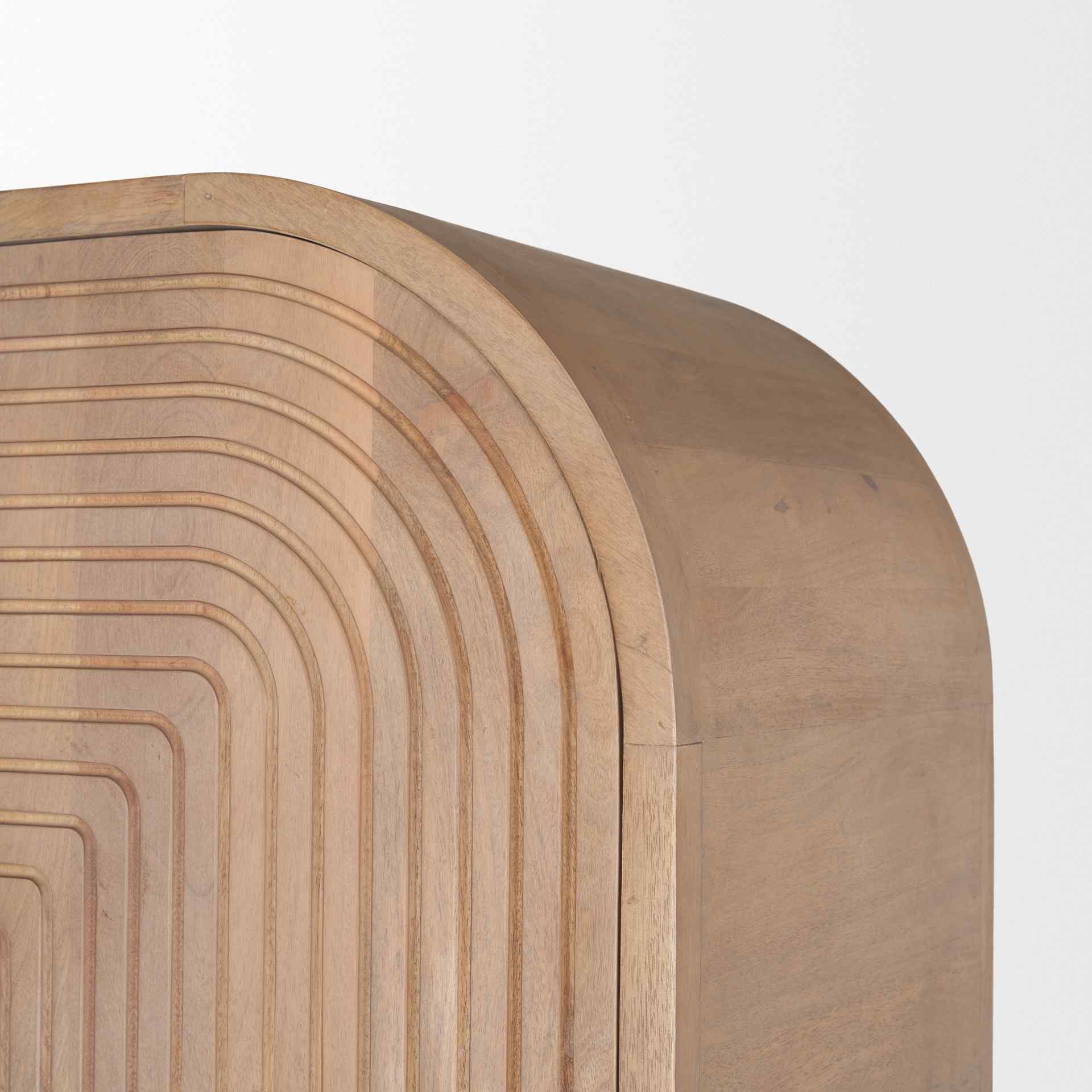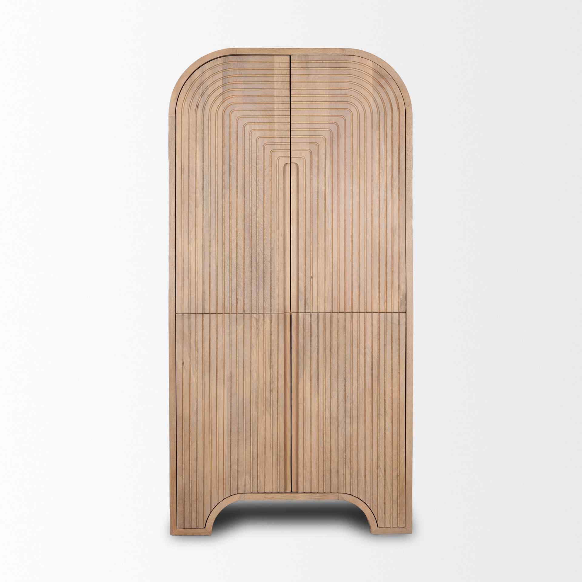 The Sorina Light Brown Wood Bookcase is a beautifully crafted piece that blends style with function. Made from solid mango wood, it features a light brown finish that highlights the natural beauty of the wood. Each of the four CNC-designed doors showcases a unique reverse fluted pattern, adding depth and texture to its appearance. With its recessed handles, the bookcase maintains a seamless look that fits effortlessly into modern living spaces. This piece is versatile, offering ample storage with two fixed and two removable shelves, making it a practical choice for organizing and displaying books, decor, and more.