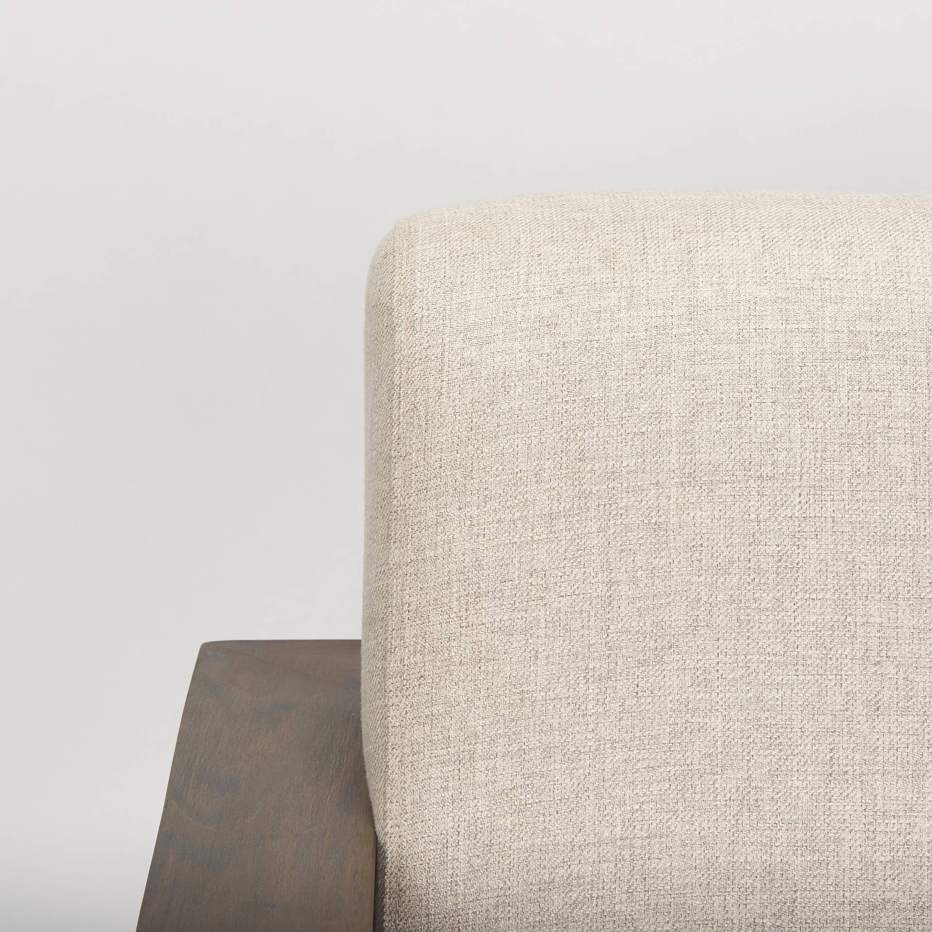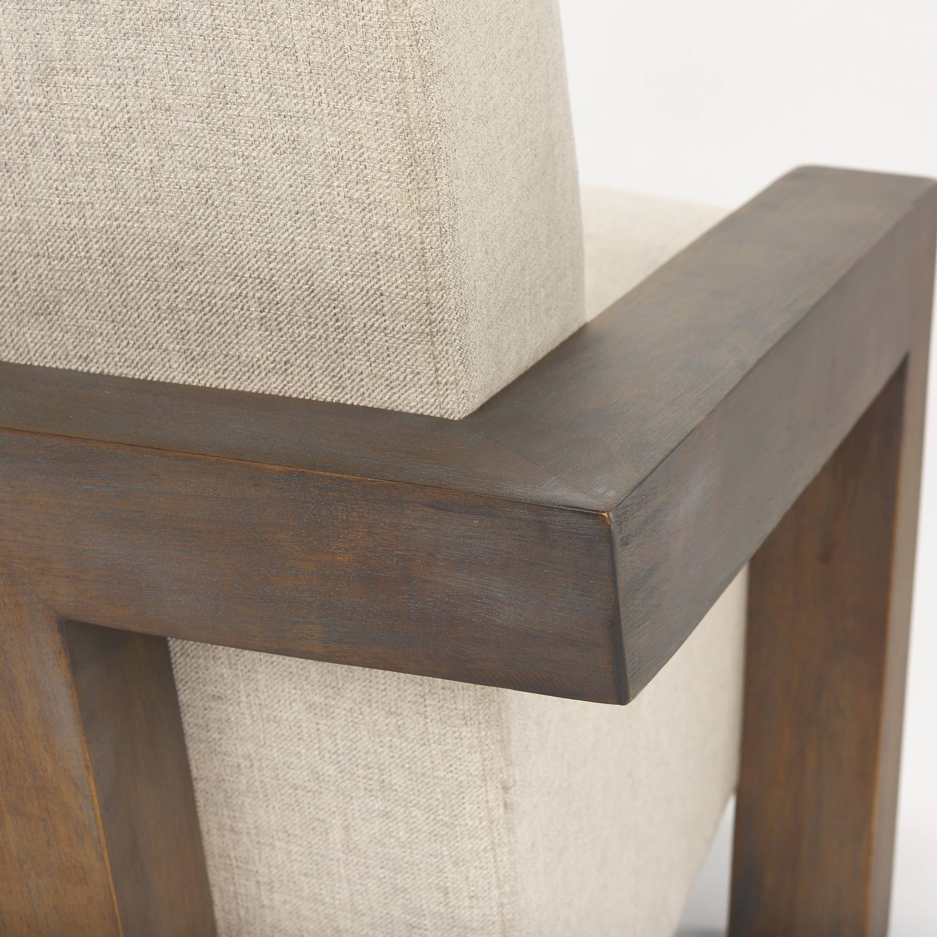 The Sovereign Oatmeal Fabric Accent Chair brings comfort and style to any room. This armchair features plush fabric-covered cushions that provide unmatched relaxation. The chair's frame is crafted from premium hardwood, finished in a beautiful antique gray washed medium brown tone, adding a touch of elegance to your decor. The solid rubber wood frame not only enhances the chair's aesthetic appeal but also provides stability and support. The seat, wrapped in oatmeal fabric, offers a comfortable space to lounge, with a slight tilt for optimal seating posture.