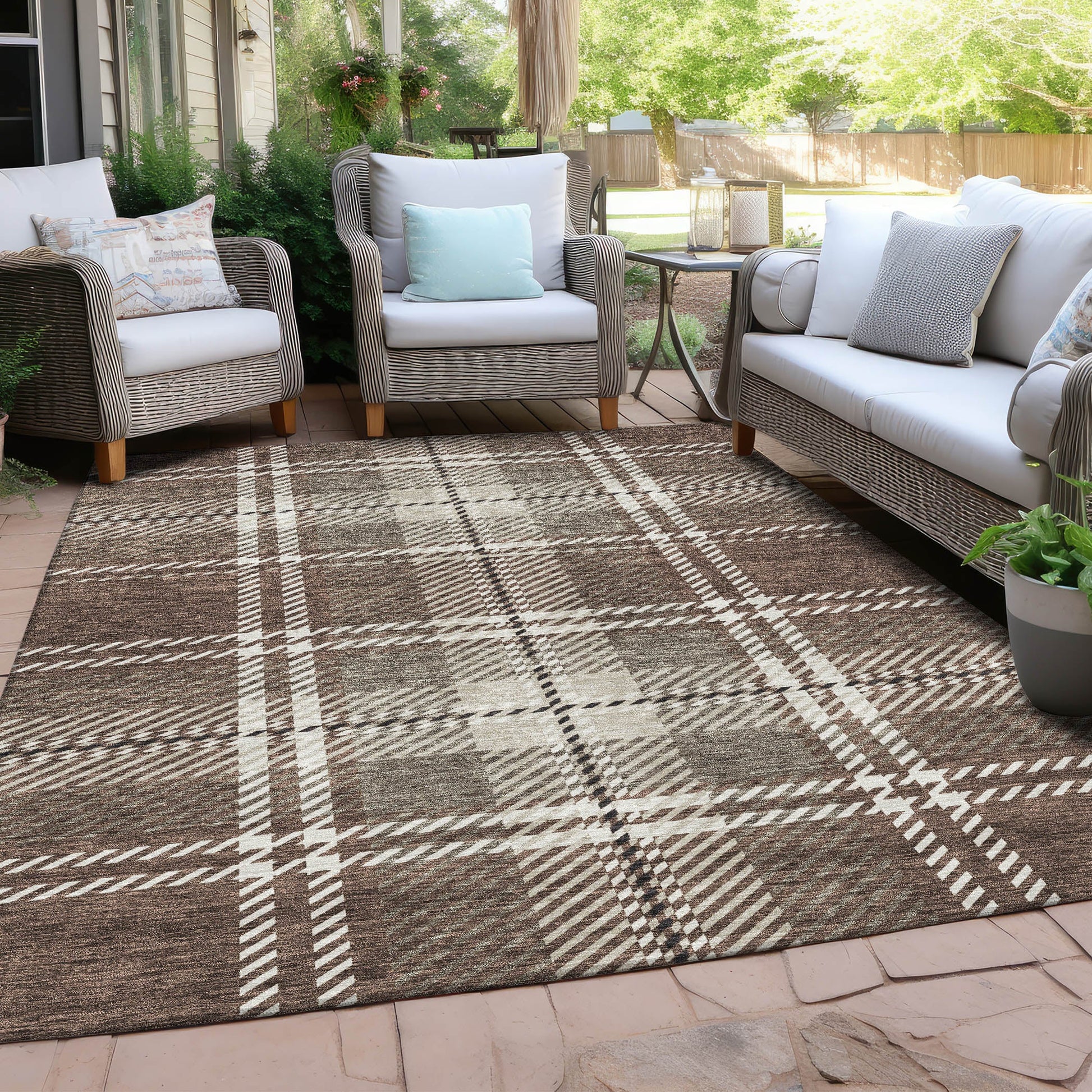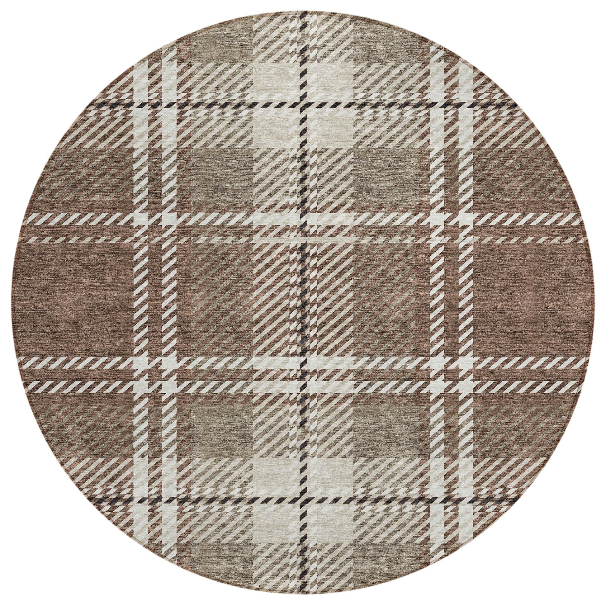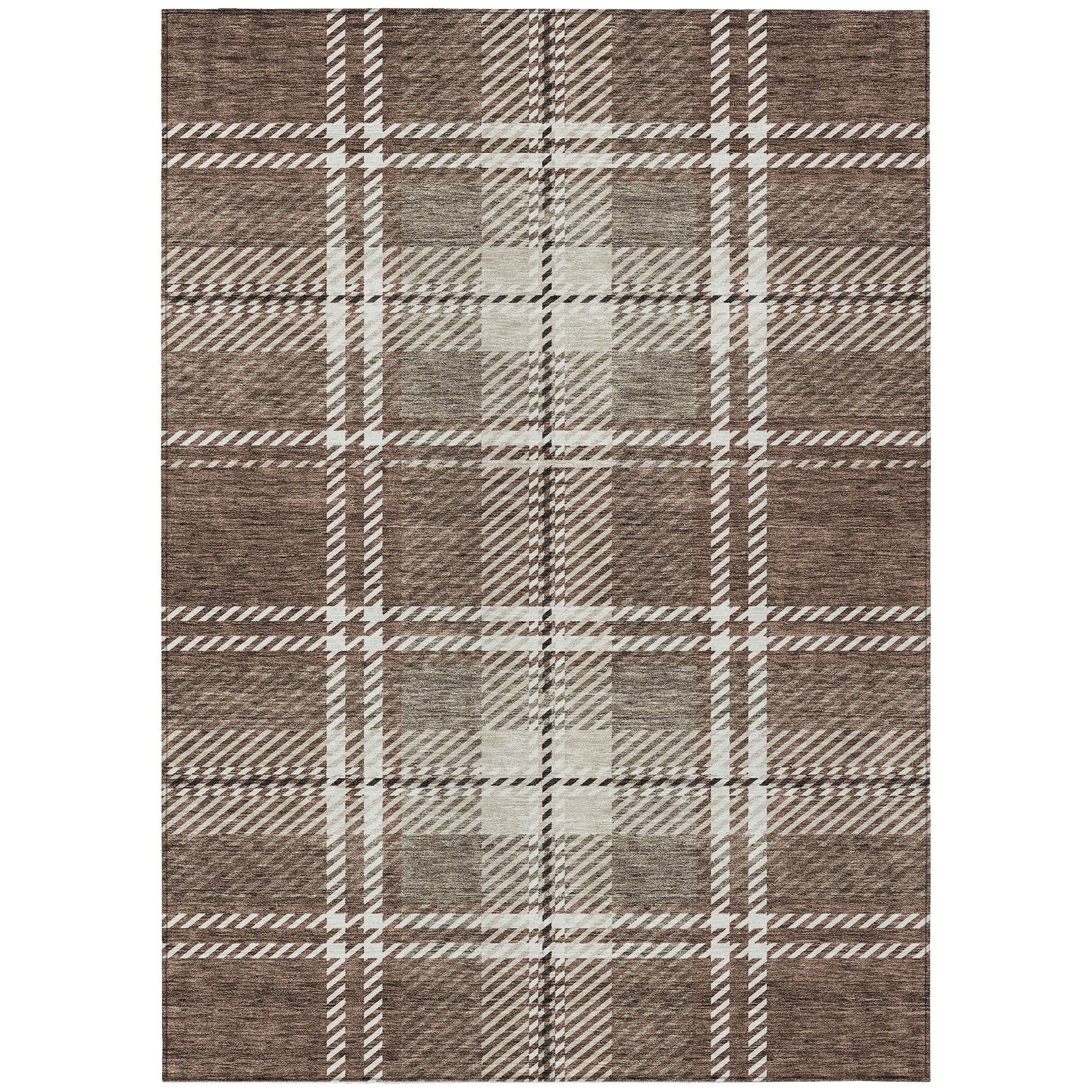Enhance your home with a rug that combines style and practicality. The Spiral Whispers Brown Washable Indoor-Outdoor Rug features a classic plaid pattern created by horizontal and vertical lines, perfect for transitional spaces. Made from 100% polyester, it’s built to last with UV stabilization for both indoor and outdoor use. Its ultra-thin design makes it easy to place anywhere, while the non-skid backing ensures safety. Enjoy the convenience of a machine-washable rug, ideal for busy homes with kids and pets. Choose from various sizes to suit your needs, and bring elegance and function to your living area.