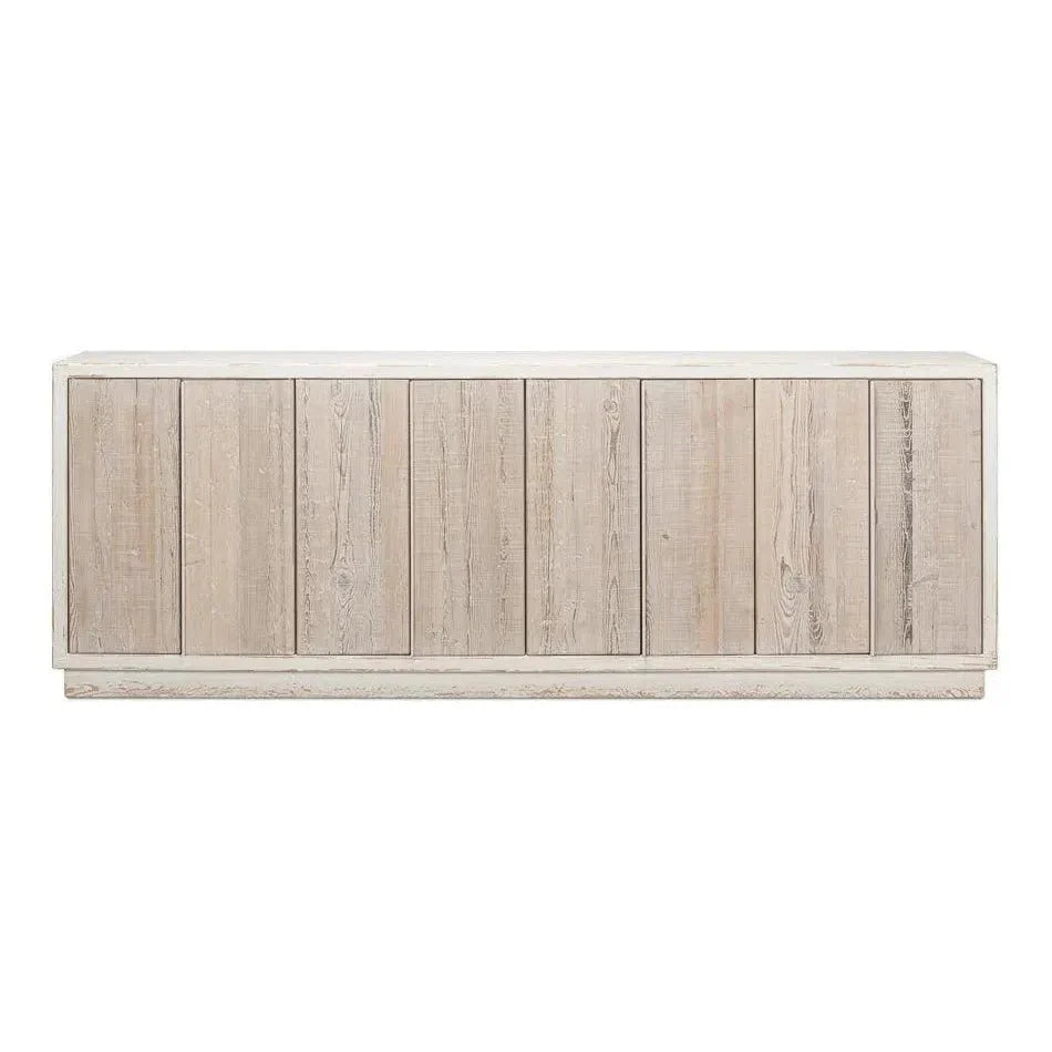 Elevate your space with Stefano Extra Long Narrow Sideboard Slim Credenza Antique White. Transform your transitional decor with this standout piece featuring charming weathered doors and an elegant antique white finish. Dare to unleash sophistication and practicality in your space with this bold and functional credenza.