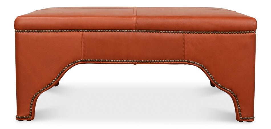 Experience the perfect blend of style and functionality with this stunning cocktail ottoman. Crafted from luxurious top-grain cowhide in a captivating Hermes Brown, it offers a warm burnt orange hue that adds a touch of elegance to any room. The ottoman's contemporary design is complemented by a curved base, adding a unique flair to your living space. Whether you're using it to rest your feet or as a stylish centerpiece, this ottoman promises exceptional comfort and sophistication.