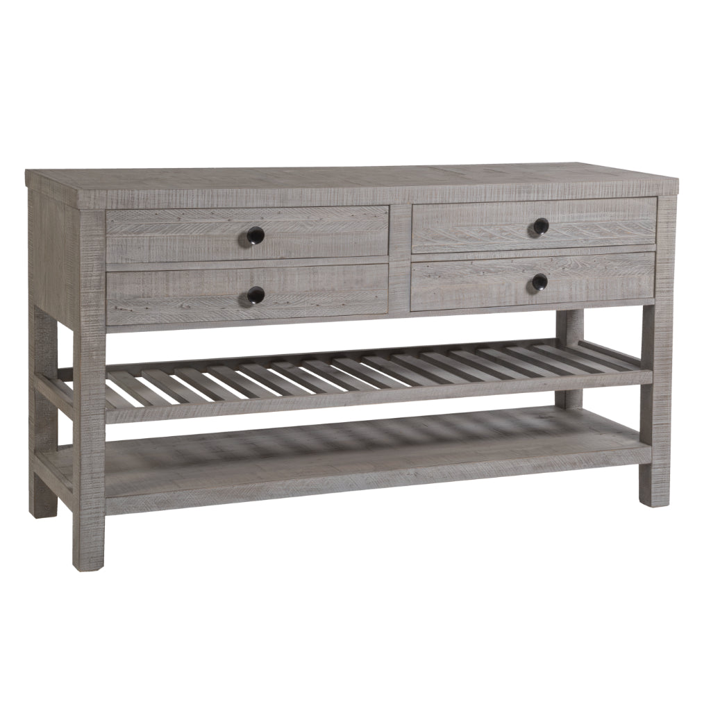 Inspired by modern, rustic living spaces, the Studio 20 collection from Palmetto Home brings new life to old materials. Distressed solid pine from reclaimed wooden pallets are combined with Palmetto’s quality construction to create thoughtfully sourced and hand crafted pieces for your home. The Studio 20 Rectangular Dining Table extends to a spacious 96" with the 18" leaf inserted and is highlighted by a unique parquet design on the tabletop. The matching Upholstered Dining Chairs are covered in a linen-look 100% polyester fabric that is easy to care for. A spacious credenza adds both additional serving space, and storage to your dining room or kitchen. The subtle, water-based Grey finish with fresh white glaze highlights the wood’s natural grain and imperfections. Visible nail holes, scratches and divots pay homage to the history and character of reclaimed wood, giving each piece a unique story. The Studio 20 10-piece dining set includes one (1) dining table with 18" leaf, six (6) dining Dining Chairs, two (2) dining arm charis, and one (1) credenza.