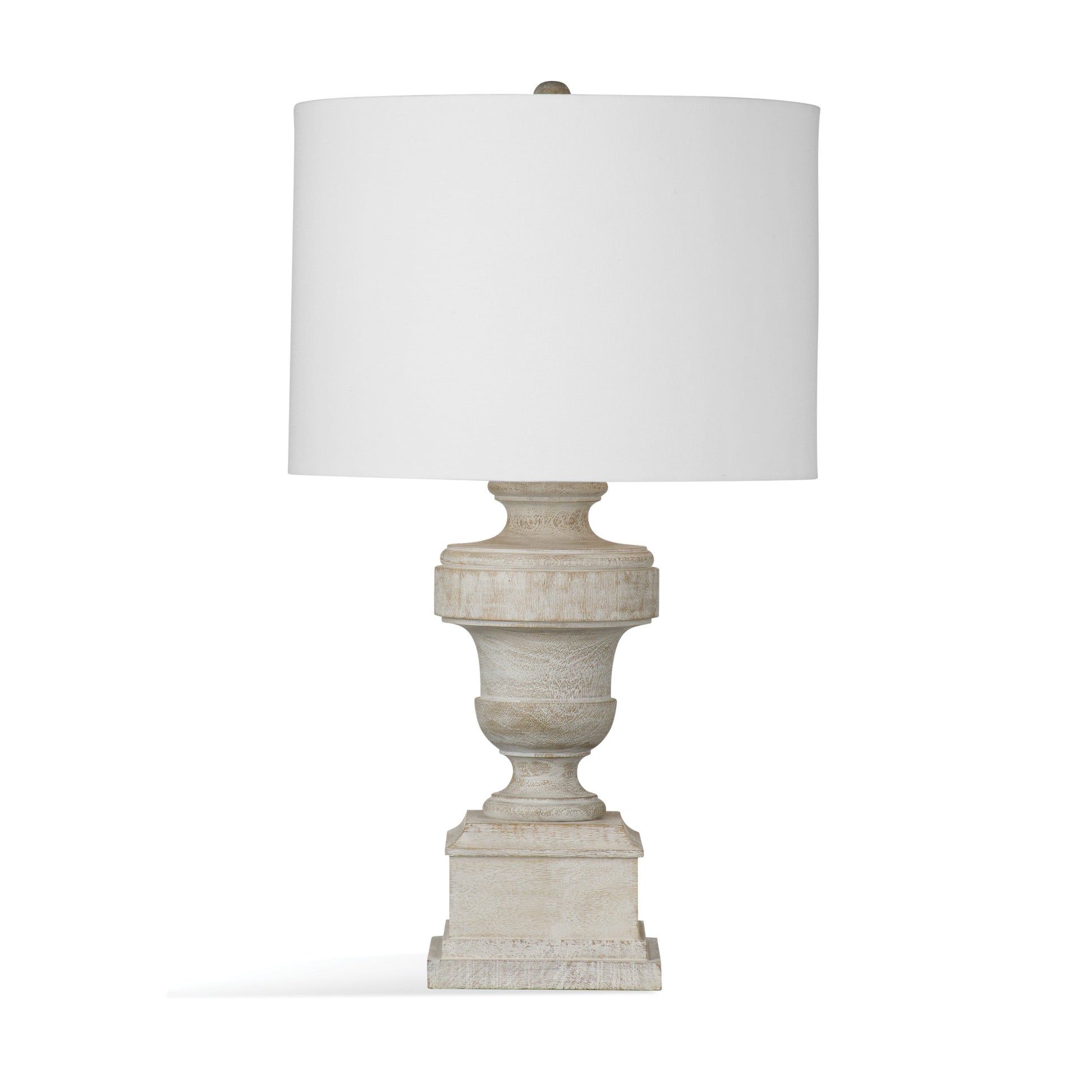 Stuttgart Table Lamp is architectural in design and crafted of wood with a drum shade. Finish: white washed. Material: wood. Wattage: 100W Max. Bulb Type: A. Socket Type: E26. The hand crafted details produced by a skilled artist lends itself to a unique technique and will vary slightly. Exude confidence and style with the unique design of Stuttgart Wood White Wash Table Lamp.
