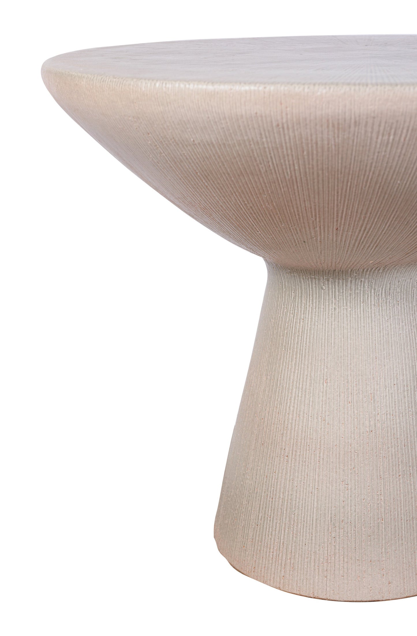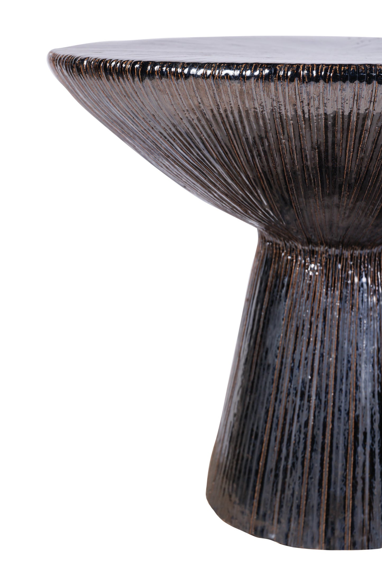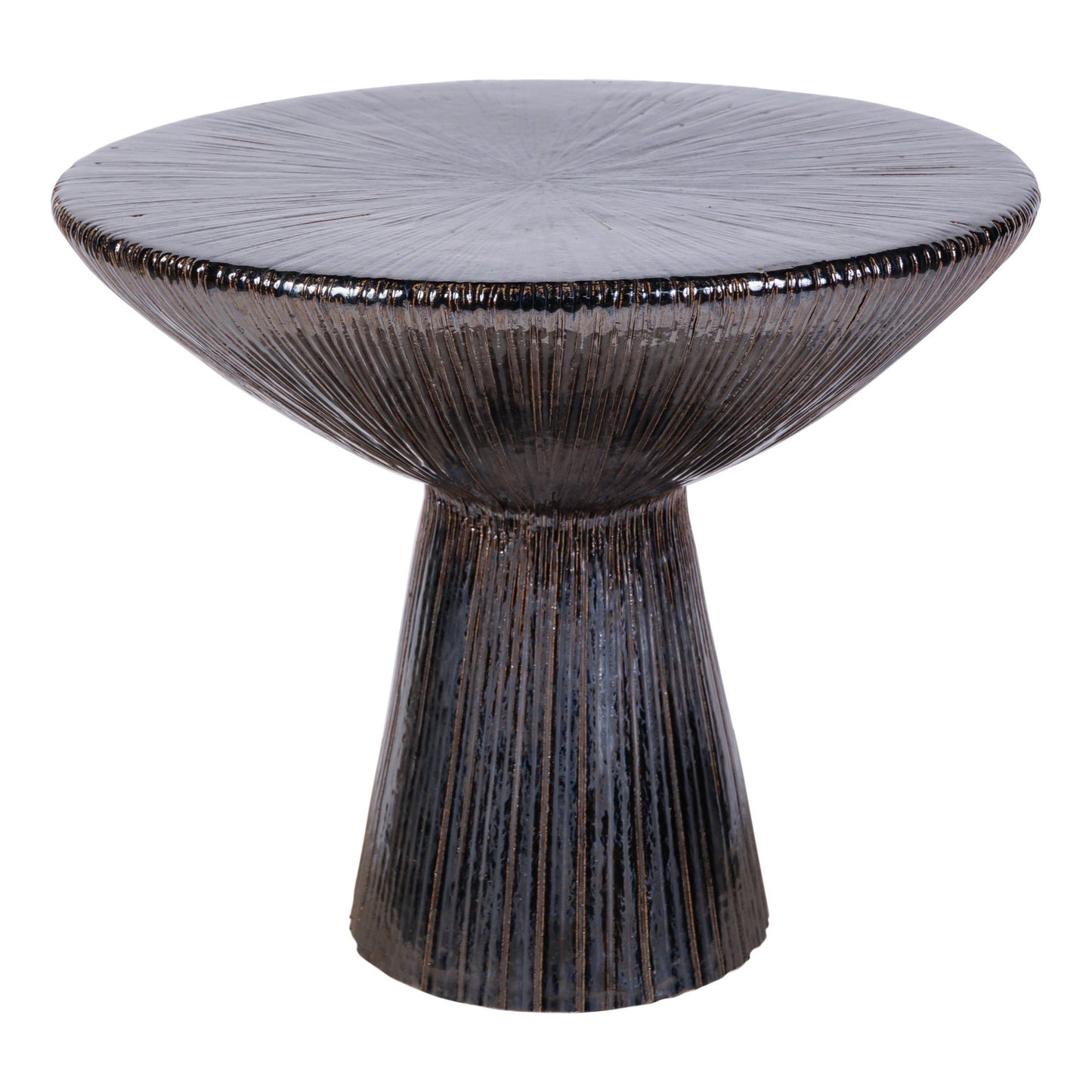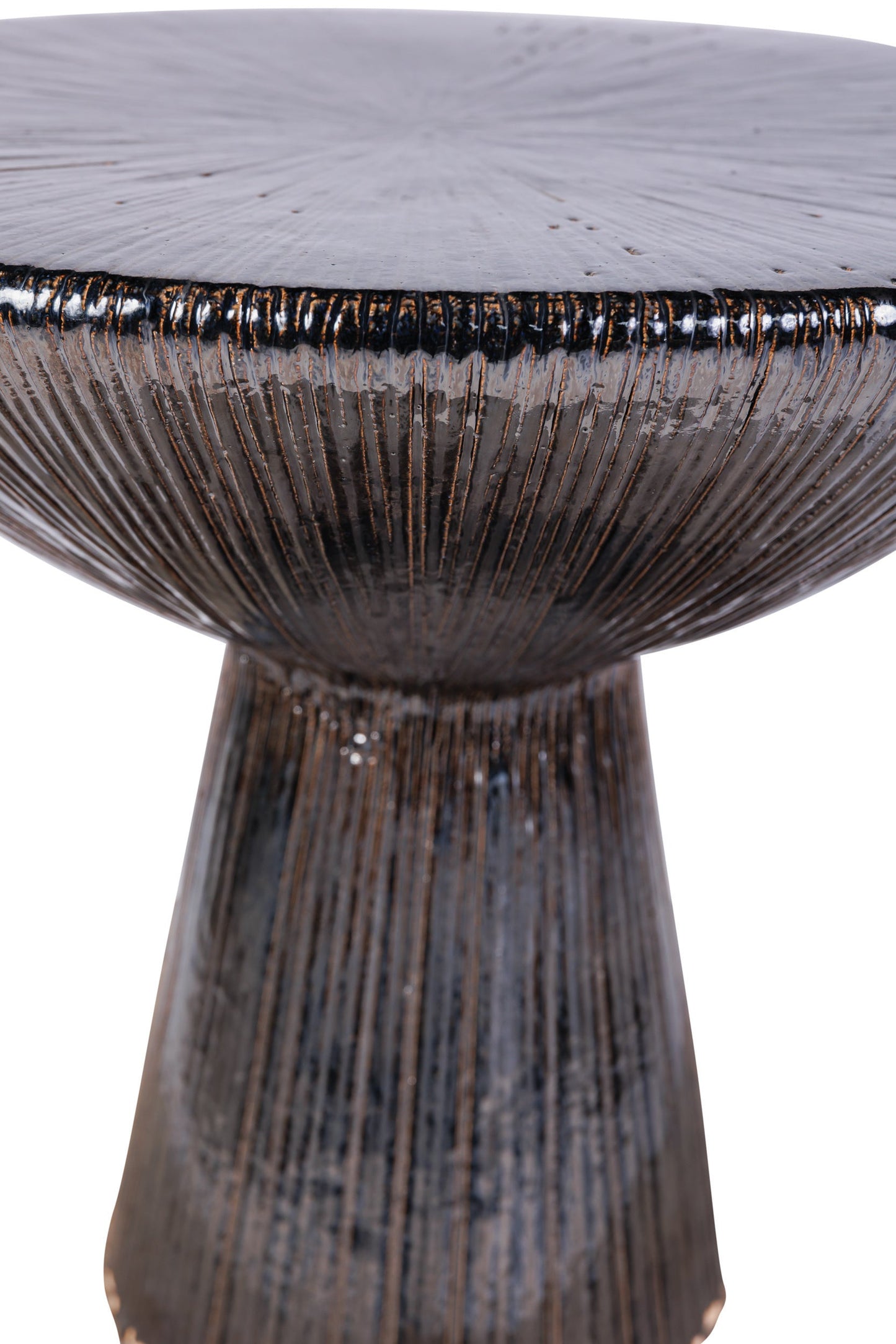 The Sunburst Accent Table is a beautifully crafted piece that brings texture, color, and a modern aesthetic to any space. Handmade from glazed ceramic, it showcases a striking sculptural design with a round tabletop and a tapered, ribbed or conical base. Each table features artisanal variations in surface and glaze, making every piece truly unique. Available in emerald texture gloss, olive semi-gloss, and smoke semi-gloss finishes, this accent table blends organic tones with refreshing highlights, effortlessly complementing various decor styles. Its timeless appeal, inspired by natural landscapes and contemporary architecture, makes it a perfect addition to both indoor and outdoor settings.