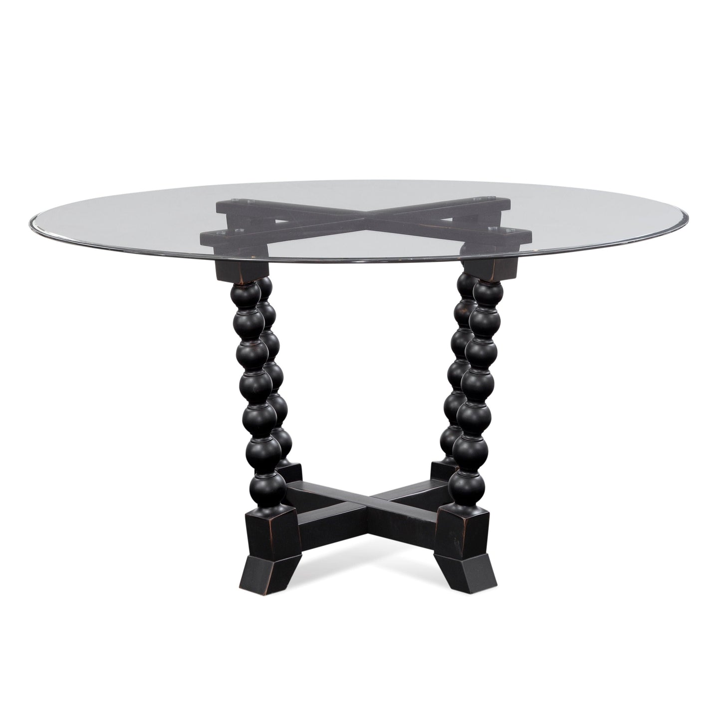 The Susanna Dining table features contemporary modern design inspiration. Features a 54" round, clear glass table top with ofgee edge treatment. Supporting the glass top is an X-style base with overstated spindled legs. The wood base is finished in antique black birch veneers. This stylish dining table comfortably seats a party of four.