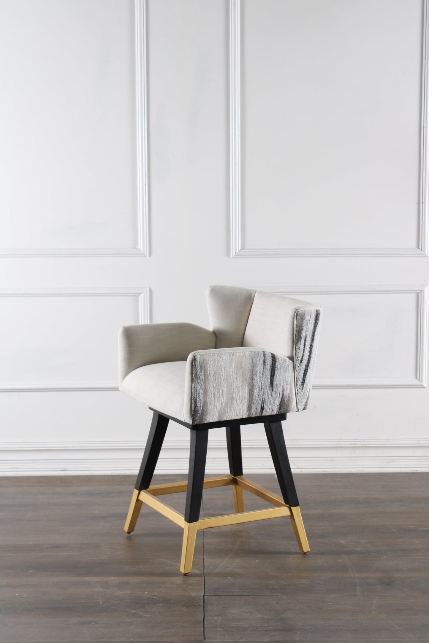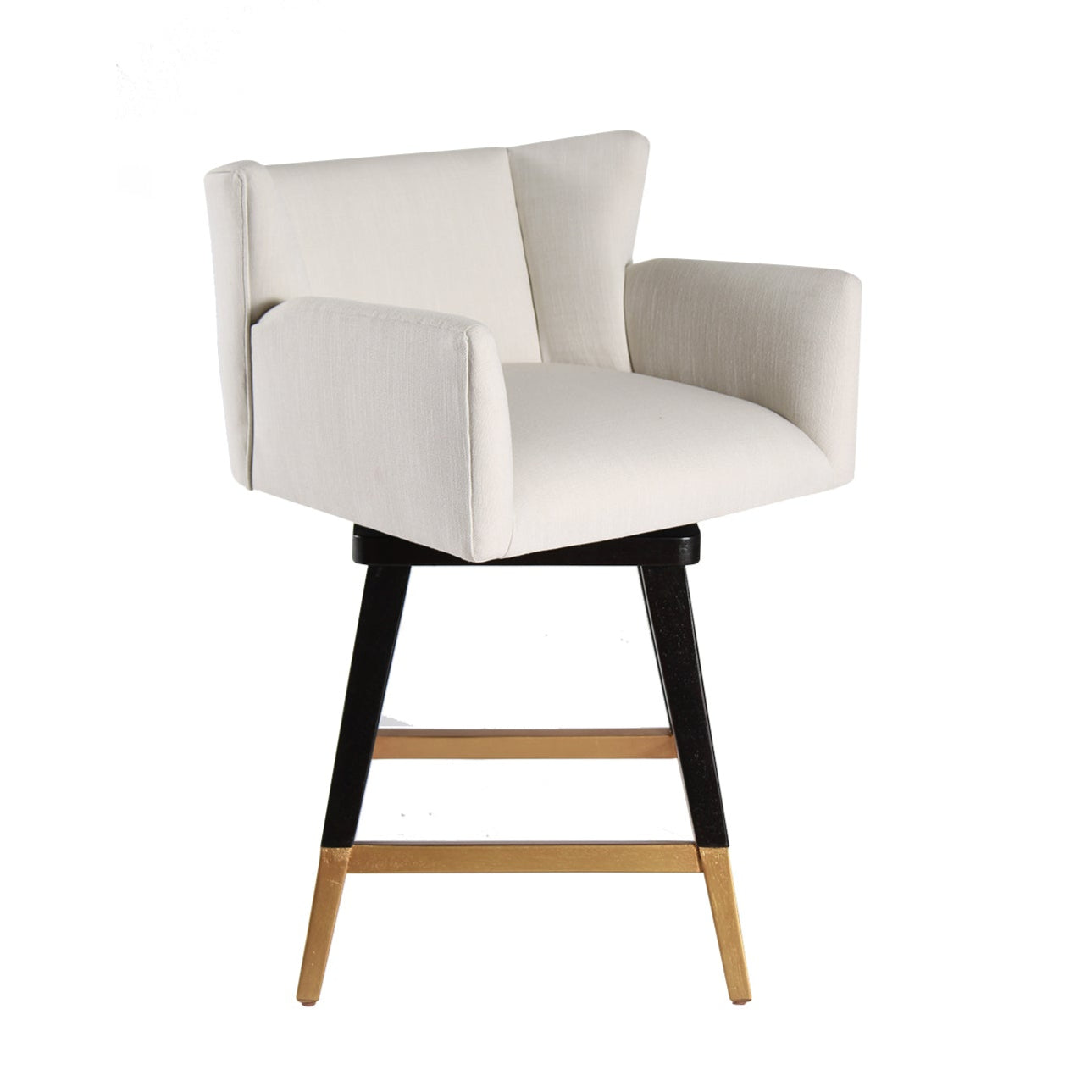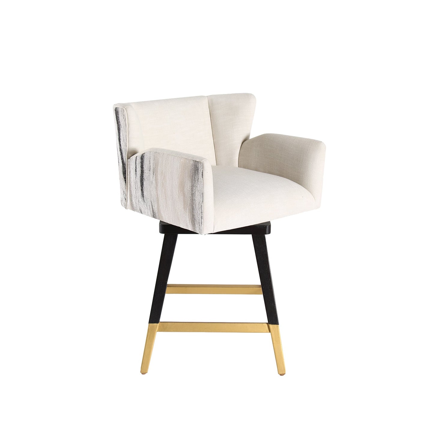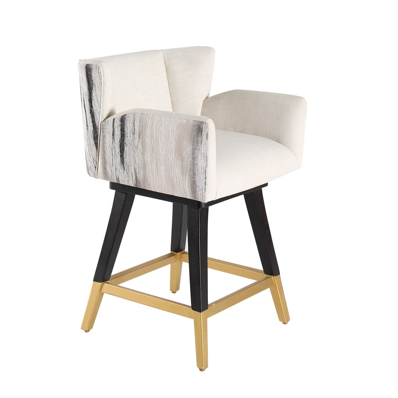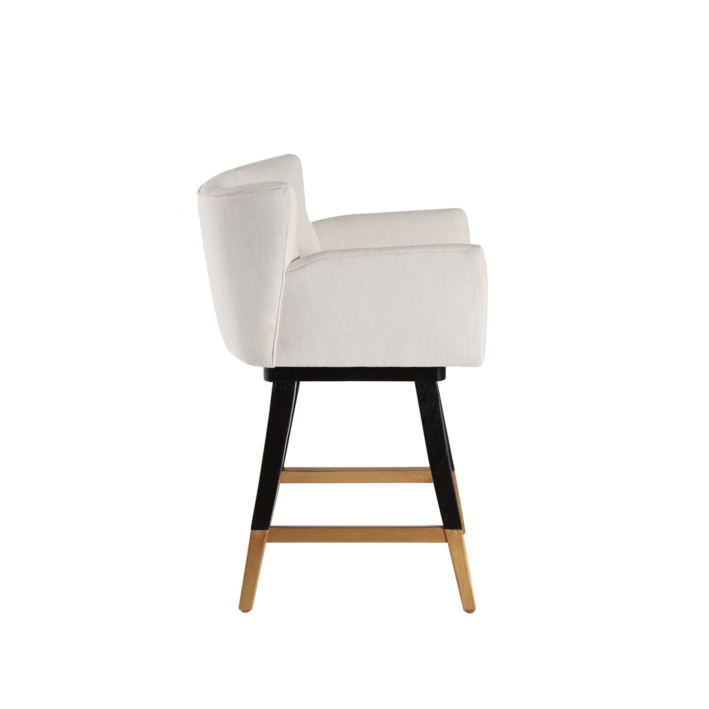 The Swivel Counterstool Grace is a refined blend of elegance, functionality, and craftsmanship, making it a sophisticated addition to any kitchen or bar area. Crafted from solid hardwoods with a sleek black finish and gold accents, this stool boasts a transitional style that seamlessly fits both modern and traditional interiors. Upholstered in high-end performance fabric in a crisp white shade, it provides a luxurious yet durable seating experience. The swivel function allows for effortless movement, making it ideal for social gatherings or daily use. Thoughtfully designed with clean lines and intricate detailing, this counter stool ensures both comfort and longevity, enhancing any space with its timeless appeal.