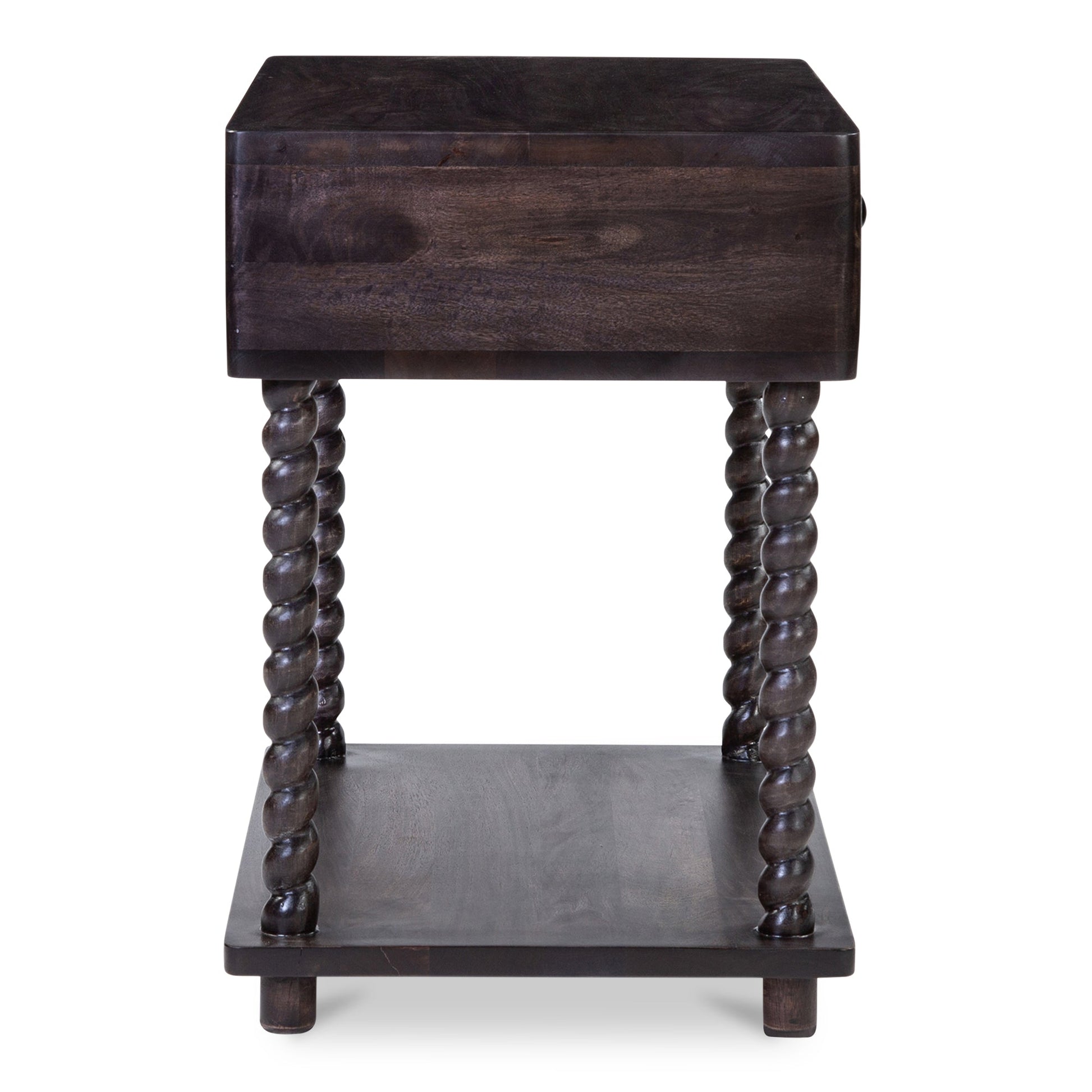 The Tabitha Nightstand in dark brown is a beautifully crafted piece made from sustainably sourced mango wood, featuring elegantly turned legs with tight spirals. Its classic design is complemented by a sleek black iron handle, adding a modern touch. The nightstand includes a lower shelf for storage, perfect for books or decor, and a soft-close drawer with side-mounted glides for smooth operation, combining both style and practicality. With its rich brown color, the Tabitha Nightstand fits seamlessly into various decor styles, from traditional to modern. Its compact size makes it ideal for smaller spaces, offering ample storage without overwhelming the room.