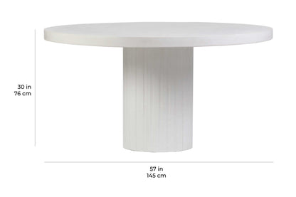 The Tama Round Dining Table offers a sophisticated fusion of modern design and natural elegance. Crafted from lightweight concrete, it features a minimalist round silhouette with a cylindrical base, showcasing vertical grooves in the slate grey finish for a striking contemporary appeal. Alternatively, the ebony white finish provides a sleek contrast, highlighting smooth textures and subtle variations in color and veining. Each handcrafted table is unique, with natural imperfections that enhance its character, making it a versatile choice for both indoor and outdoor spaces.