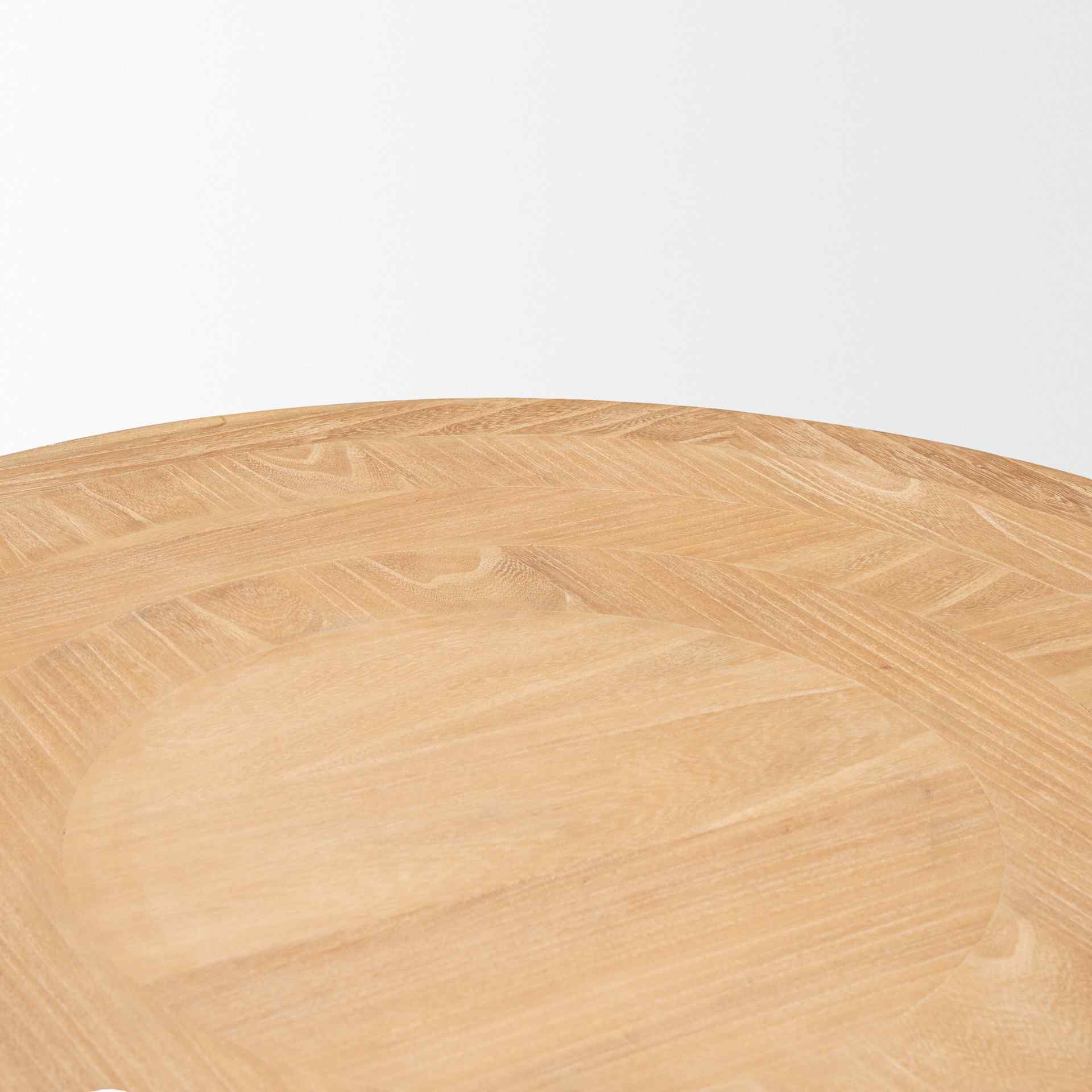 The Taylin Light Brown Wood Coffee Table brings a touch of rustic charm to any living space. Crafted from solid elm wood, this piece boasts a natural light stain that is delicately whitewashed and subtly pickled with a light wire brush finish. This technique enriches the wood's grain, offering a captivating visual texture that complements its minimalist design. The tabletop features a mesmerizing inlay pattern, finished smooth, adding an extra layer of intrigue to its simple silhouette. With four sturdy legs and bracing, this round coffee table is both stylish and functional, fitting seamlessly into various decor styles.