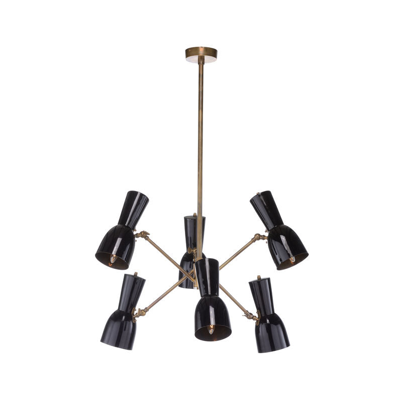 The Thayer Chandelier brings a touch of mid-century modern elegance to any room. Designed with six arms, this chandelier stands out with its matte black conical shades that can tilt to focus light exactly where you need it. The sleek black color pairs beautifully with a brass finish, adding a sophisticated contrast to the fixture. Ideal for living rooms, dining areas, or entryways, it offers both style and functionality. Its timeless design complements a range of interiors, from modern to classic, making it a versatile choice for any home. This chandelier is part of the Wildwood collection, known for its fine craftsmanship and attention to detail.