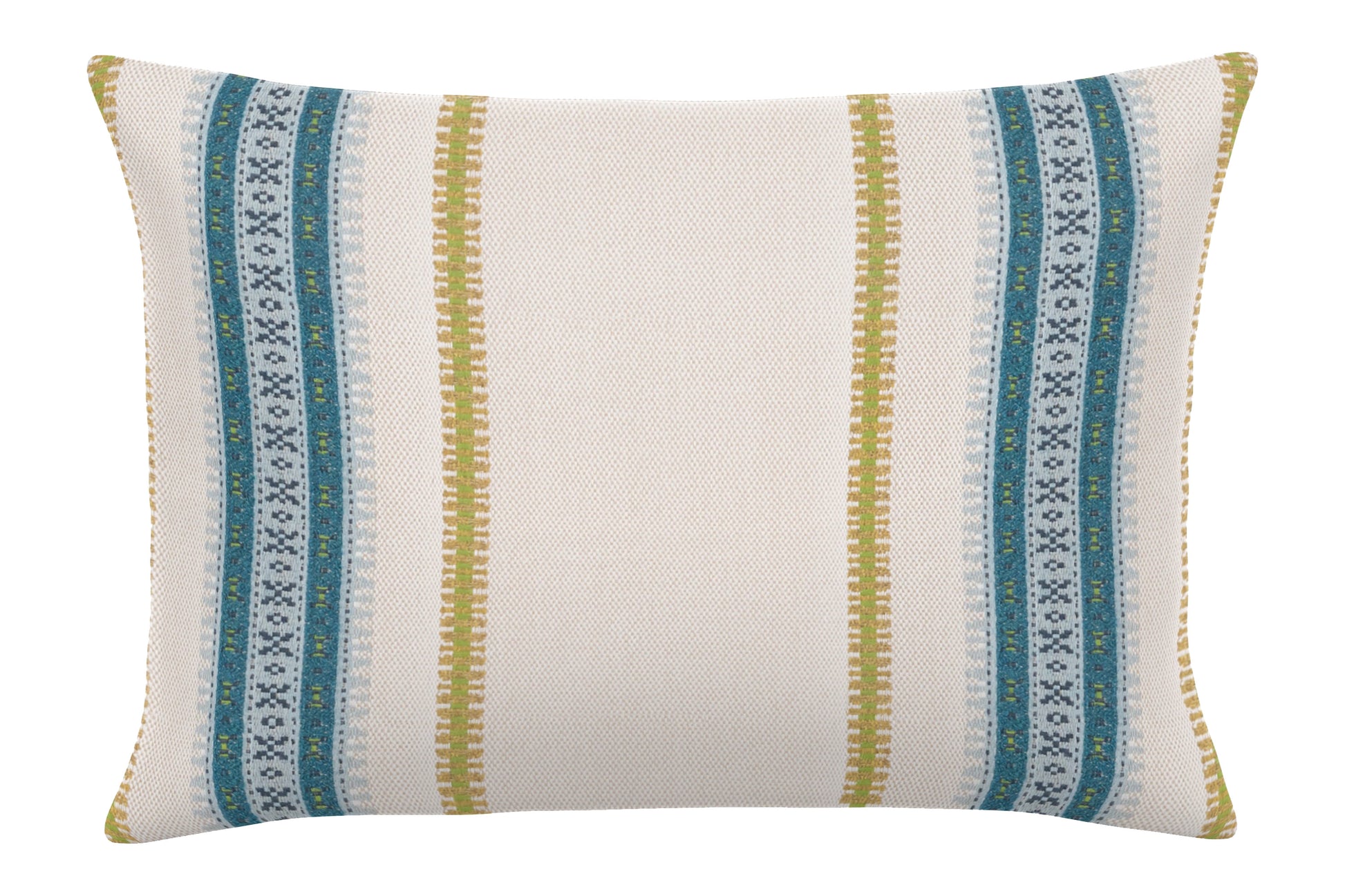 Available in both 20" Square and 20"x13" Lumbar sizes, the Thayer Resort Outdoor Pillow complements a variety of seating options. The cream background with vertical green and blue stripes creates a woven pattern that adds a touch of elegance to your outdoor furnishings. The proprietary faux down insert provides comfort, making these pillows perfect for lounging. Designed to withstand the elements, they are durable enough for outdoor use yet beautiful enough to enhance indoor spaces as well.