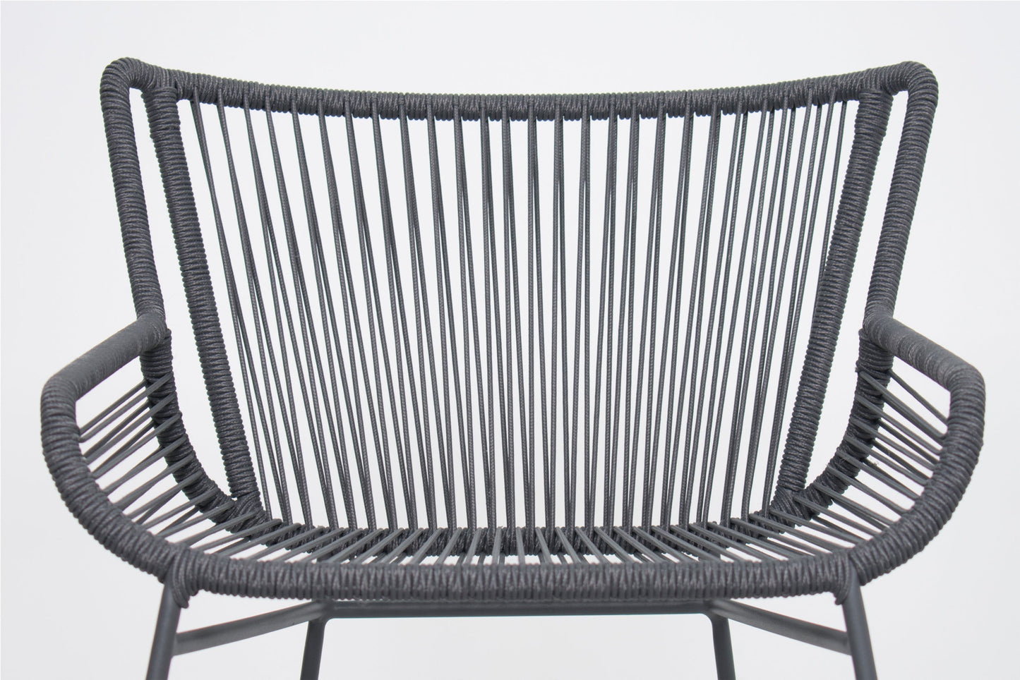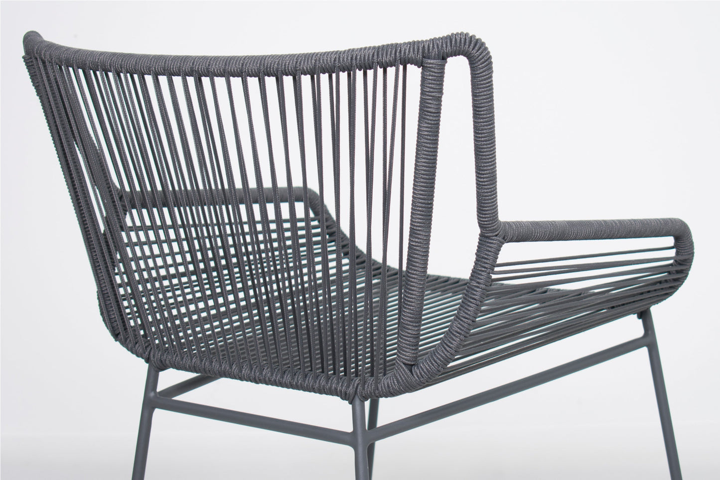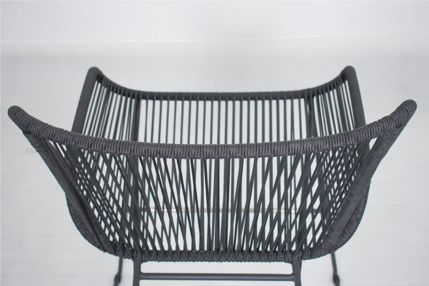 - Powder-coated galvanized steel frame, polypropylene rope weave, black nylon glides