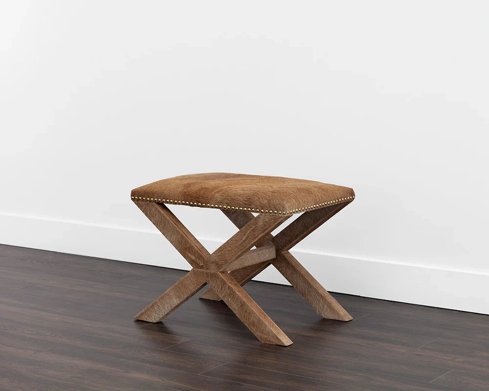 Infuse an exotic touch to any space with this richly textured stool. The wooden frame and seat are upholstered in hand-stitched genuine brown cowhide. The brass nailhead detailing around the seat adds a sophisticated touch. As cowhide is a natural material, organic markings on the animal may still be visible, and there may be apparent differences in hair length, color, and pattern. No two pieces are alike, making each stool unique. The stool is also available in grey.