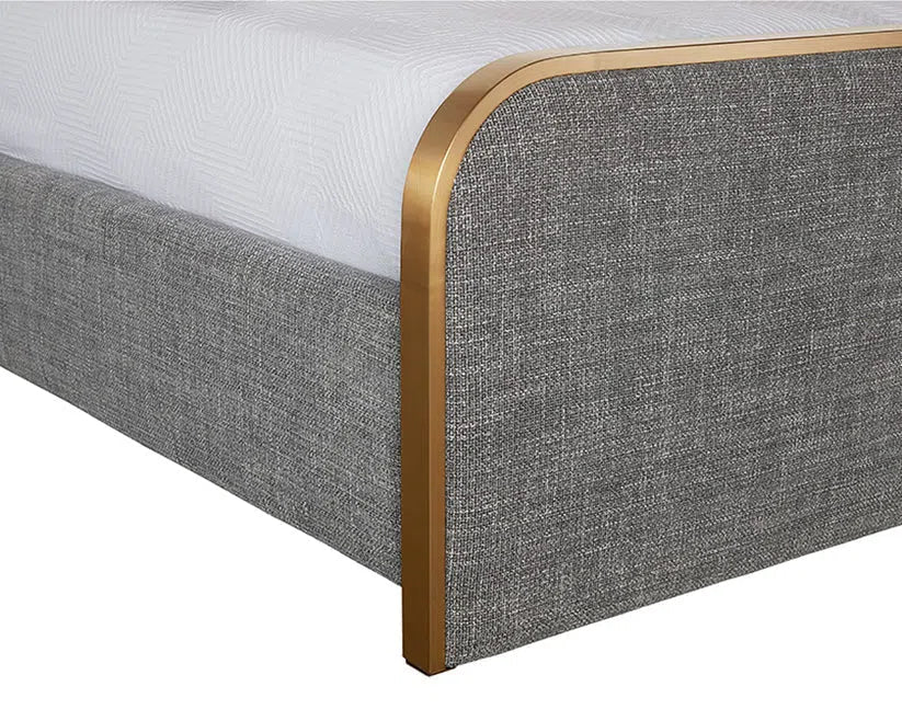 Effortlessly sleek and modern, the Tometi Bed is a brilliant addition to any bedroom space. It features a gently curved headboard and footboard upholstered in either chacha cream or chacha grey fabric, accented by a stainless steel border in a brushed gold finish. No box spring is required as slats are included for support. Available in Full, Queen, and King sizes, each variation maintains the bed's elegant design and ensures a stylish centerpiece for your bedroom.