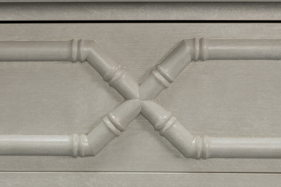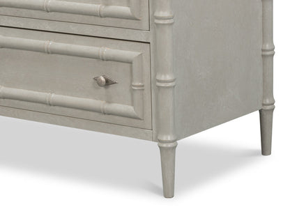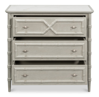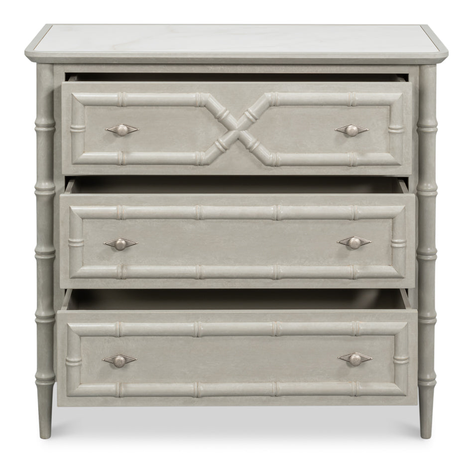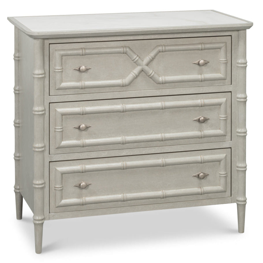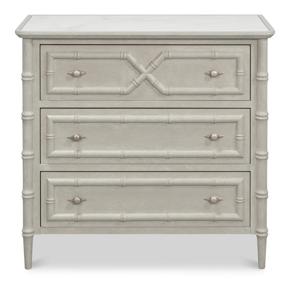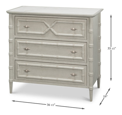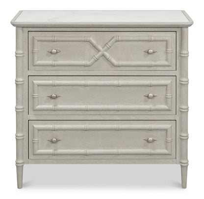 This versatile and sophisticated chest combines elegant design with everyday practicality. It features three spacious drawers that offer generous storage while maintaining a refined appearance. The drawers are adorned with bamboo accents, lending a touch of natural texture that elevates its classic silhouette and adds visual interest.