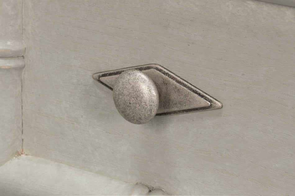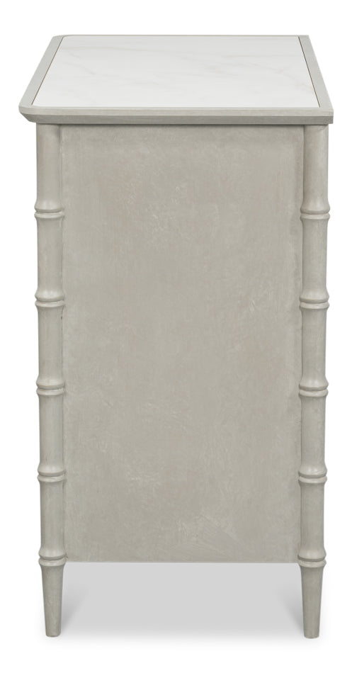 Finished in a rich Italian Grigio tone, the chest is beautifully complemented by antique pewter hardware that adds depth and character. A smooth white porcelain top crowns the Tortola, providing a crisp contrast to the darker finish and completing the piece with a polished, timeless touch. Perfect for a variety of interior styles, this chest brings understated elegance to any room.