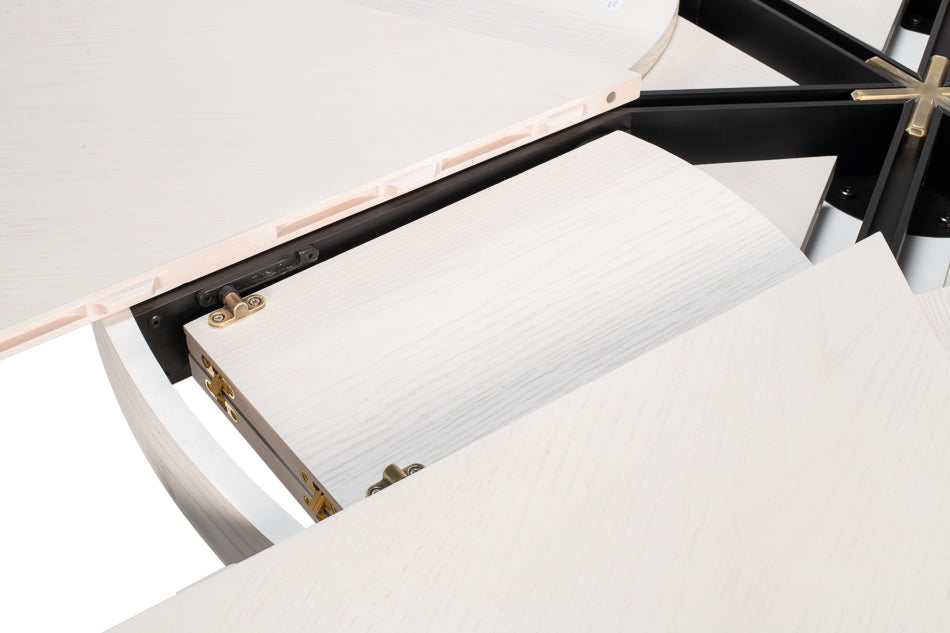 The Tower Jupe Dining Table combines craftsmanship, versatility, and a modern aesthetic in one distinctive design. Crafted from oak and textured iron, this round table features a segmented top and a geometric base enhanced with handcrafted metal bands for structural strength. Available in natural bleached oak, white, rich brown Palladio, and grey Moonskin finishes, each table showcases a blend of organic wood grain and hammered iron, making it a refined statement in any decor. Its understated design, with curved legs and petal-like expansion leaves, complements both classic and contemporary interiors.