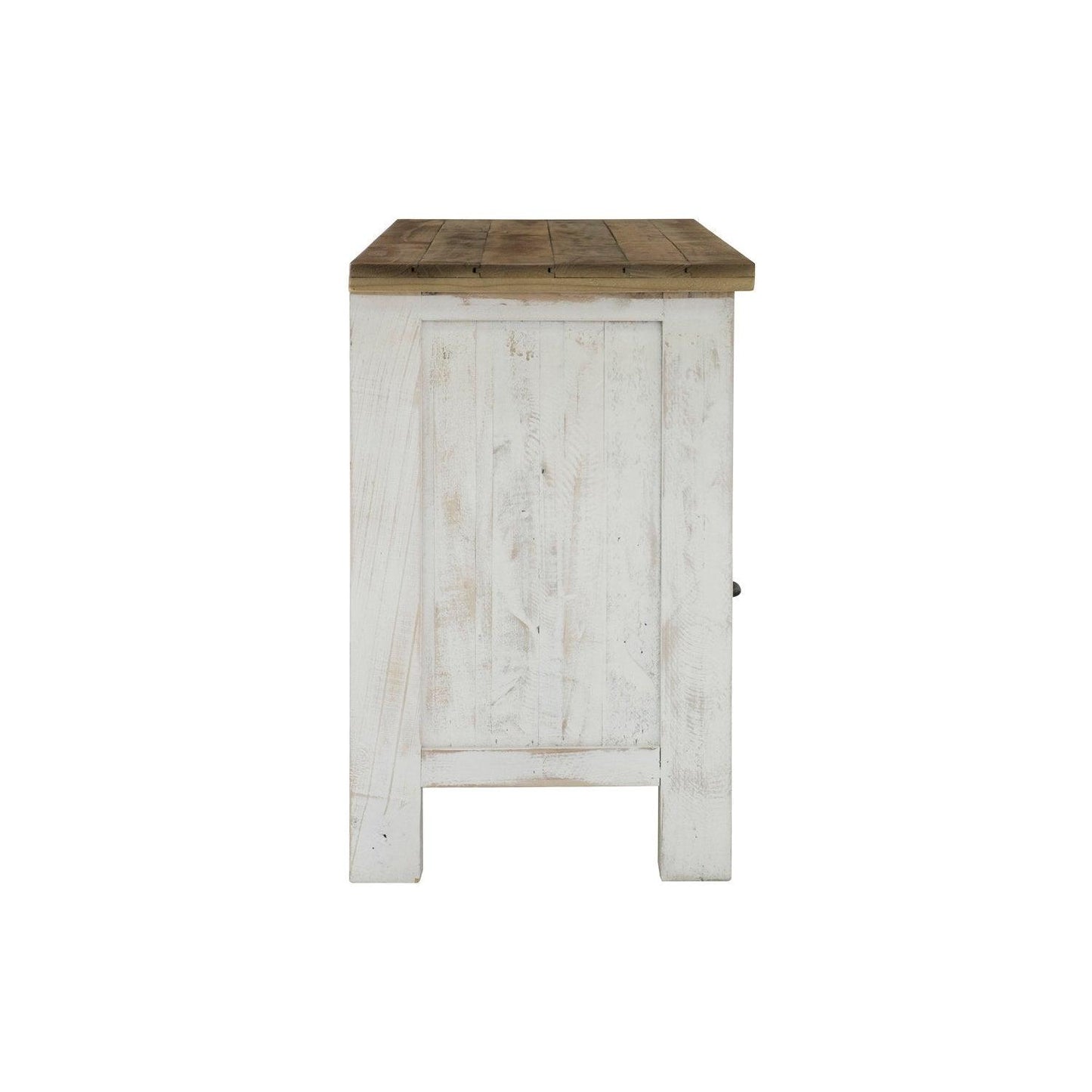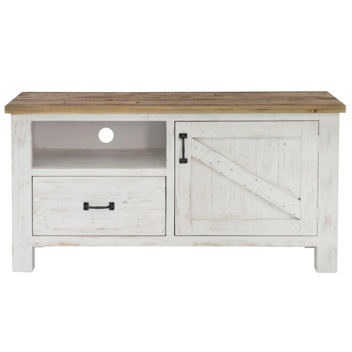Revamp your living space with the captivating Two Tone White TV Stand! Constructed from premium FSC recycled pine, this stand showcases an antique white finish and charming farmhouse gliding doors. Boasting one drawer and an open space, it caters to all your media storage needs. Embrace the rugged allure and infuse your home with a daring touch of design.