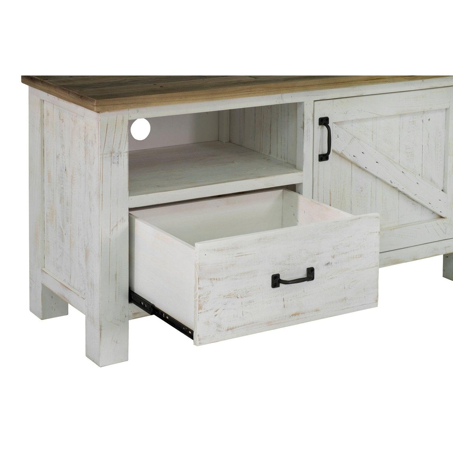 This item exudes a natural rustic charm. The collection features an antique white finish, farmhouse gliding doors, and ample storage space! Other highlights include FSC recycled pine, one drawer, and one open space. Elevate your living experience with this enchanting TV stand that brings a touch of country living and farmhouse style to your home.