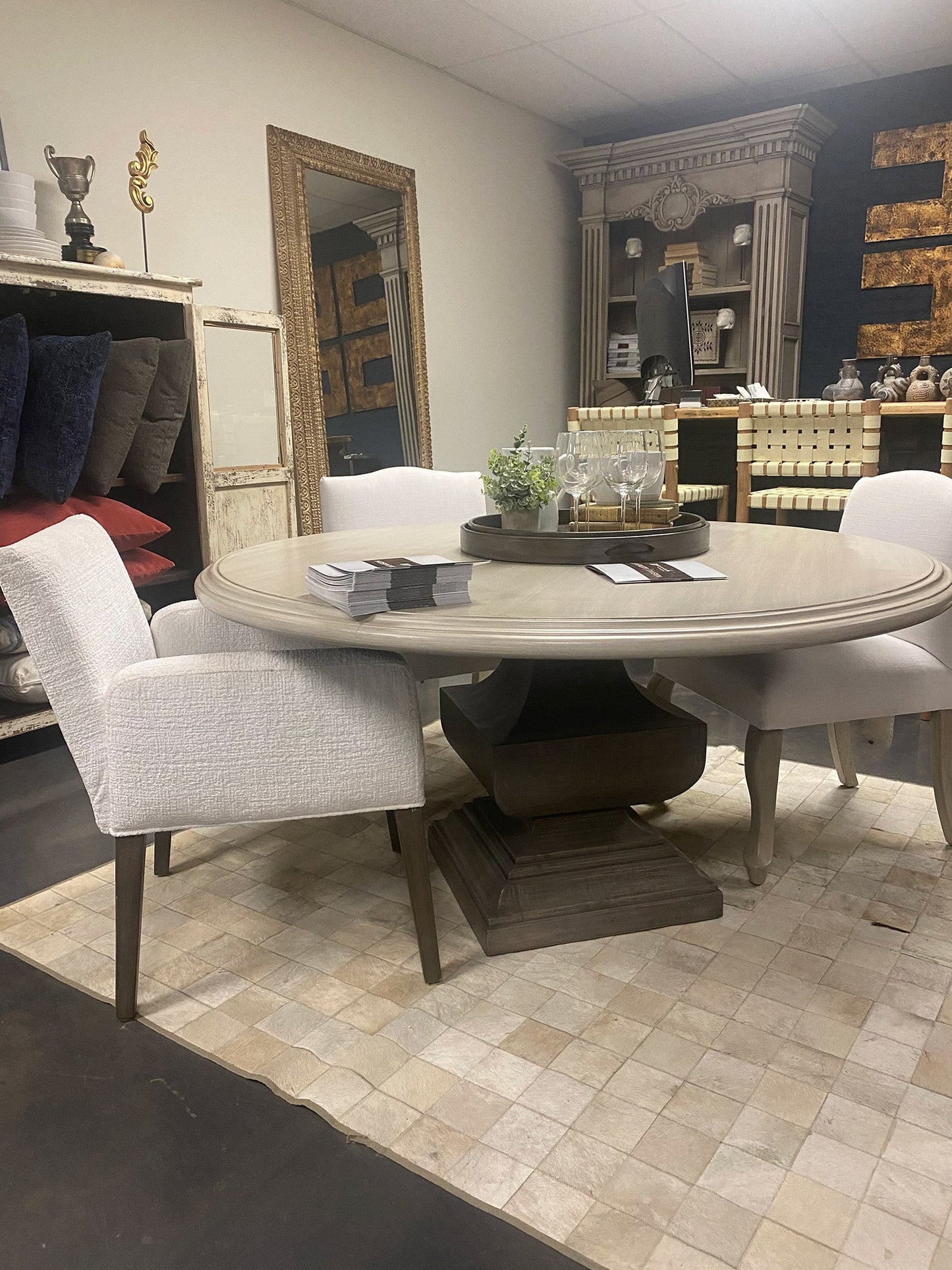 Experience the perfect blend of sophistication and resilience with this stunning round dining table featuring a square base and oversized moldings. The two-tone finish and 60-round beveled top make it a standout piece that exudes both style and strength.