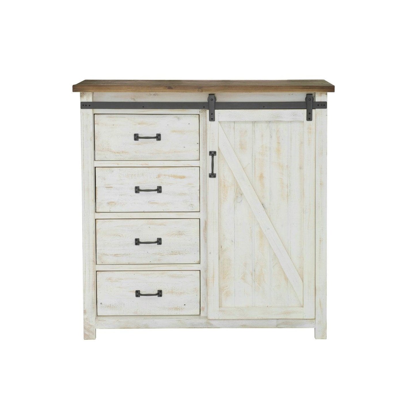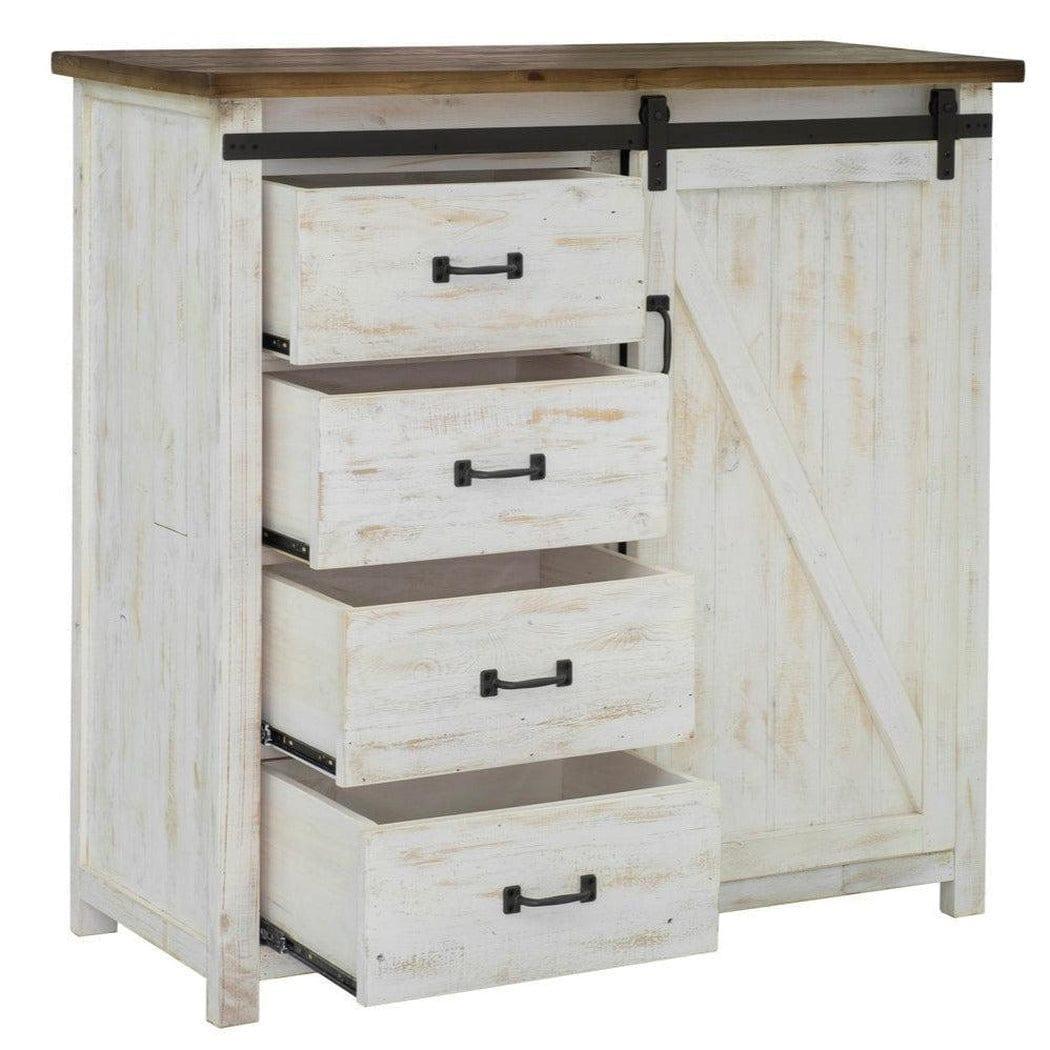 Embrace rustic charm with the Two-Tone White Reclaimed Wood Provence 4 Drawer Chest With 1 Door! Made with sturdy reclaimed Pine, this cabinet features an antique white finish and farmhouse gliding doors for easy access to stored items. Elevate your storage game and add a touch of adventure to your home decor!