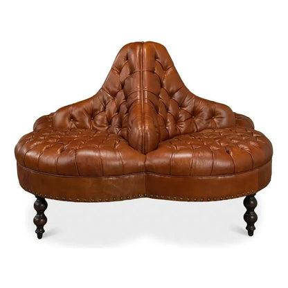 Embrace your adventurous side with the Unique Curved Leather Lobby Sofa! Featuring premium rubberwood and luxurious brown leather, this classic piece exudes timeless sophistication. Its generous seating for three and expert craftsmanship make it the perfect choice for both entertaining and unwinding. Make a daring statement in any living area with its 57" width, 57" depth, and 18" seat height. An embodiment of elegance, the brown Lobby Sofa offers an enduring allure.