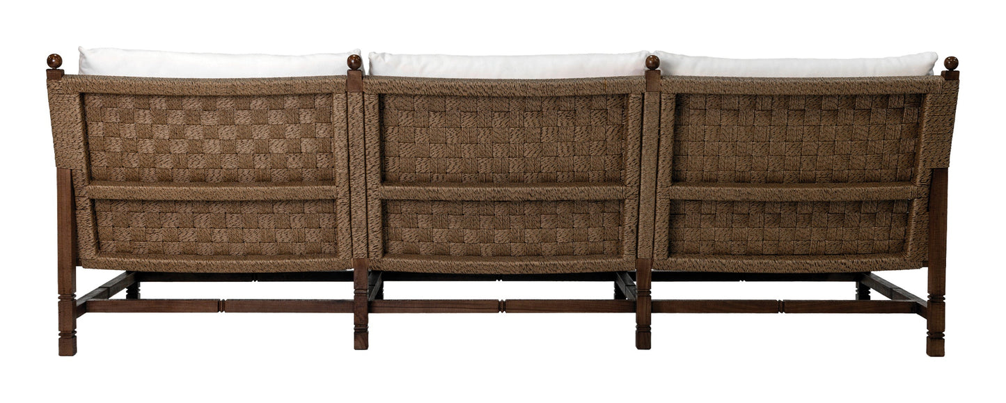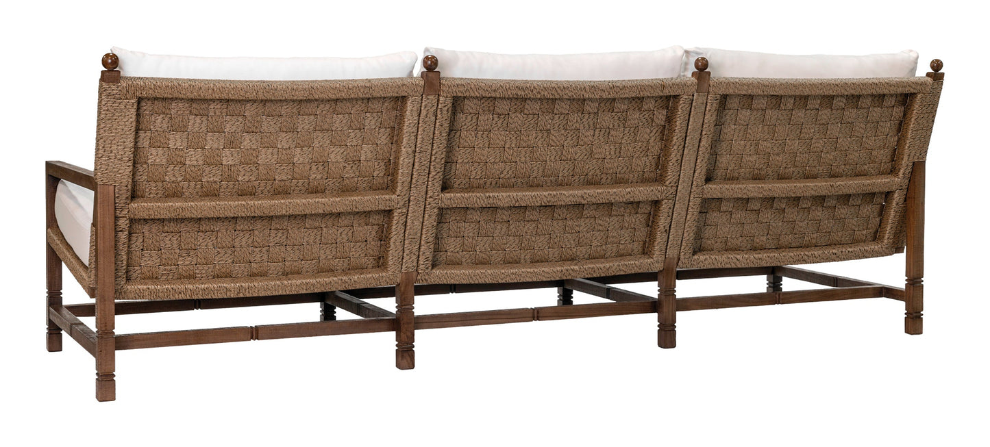 The Vaterra 3-Seat Sofa brings a calming, natural feel to any space. Made from Indonesian teak and Viro synthetic rattan, it combines sustainability with style. Its weathered pecan matte finish gives it a warm, inviting look, making it perfect for both indoor and outdoor settings. The sofa's design embraces the beauty of natural materials, celebrating traditional craftsmanship and a connection to the earth. With deep seating and plush white cushions, it offers both comfort and elegance. The neutral tones and classic design make it a versatile addition to any decor.