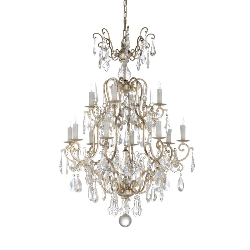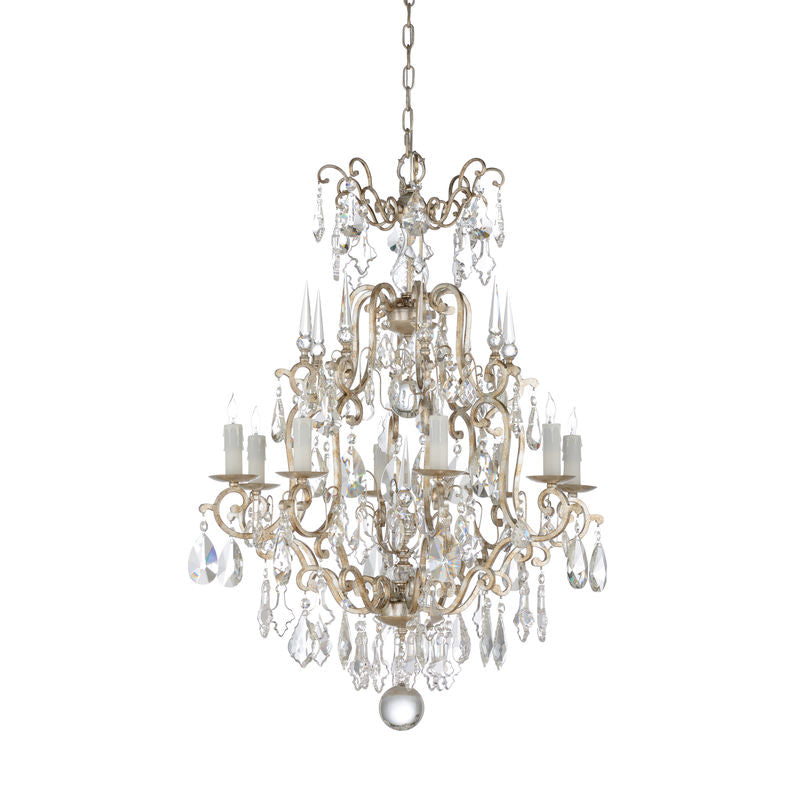 Transform your living space with the Versailles Chandelier, available in two sizes to suit various room dimensions. This chandelier features an antique silver leaf finish that radiates timeless elegance. Its classic design includes candle-shaped lights, with the larger version offering twelve lights and the smaller version offering eight, both ensuring a warm and inviting glow. The intricate scroll design and clear crystals add sophistication and sparkle, creating a dazzling effect that enhances the ambiance. Whether placed in dining rooms, foyers, or living spaces, this chandelier makes an exquisite centerpiece in any room. The Versailles Chandelier is crafted with attention to detail, combining functionality with vintage charm.