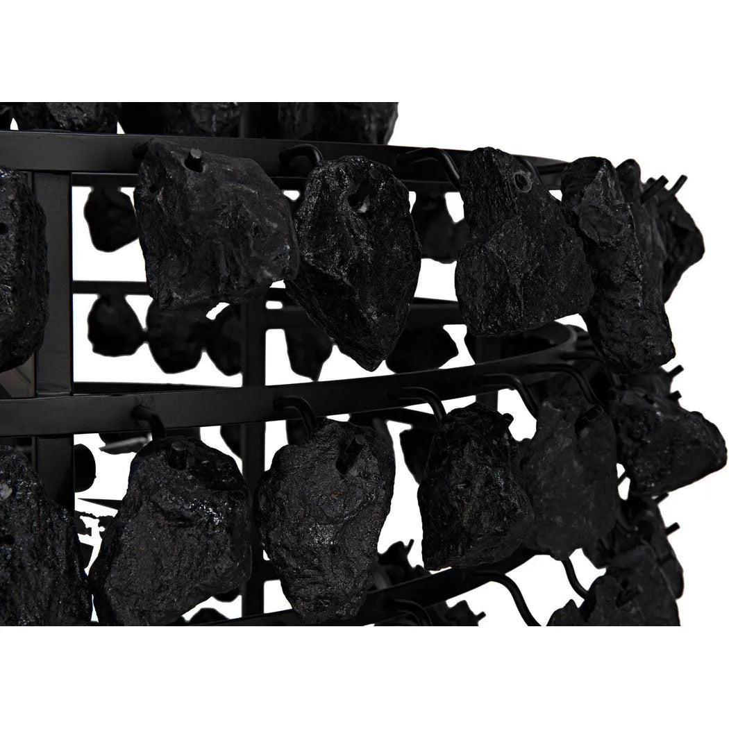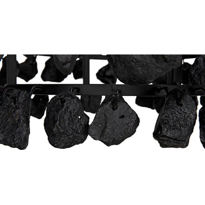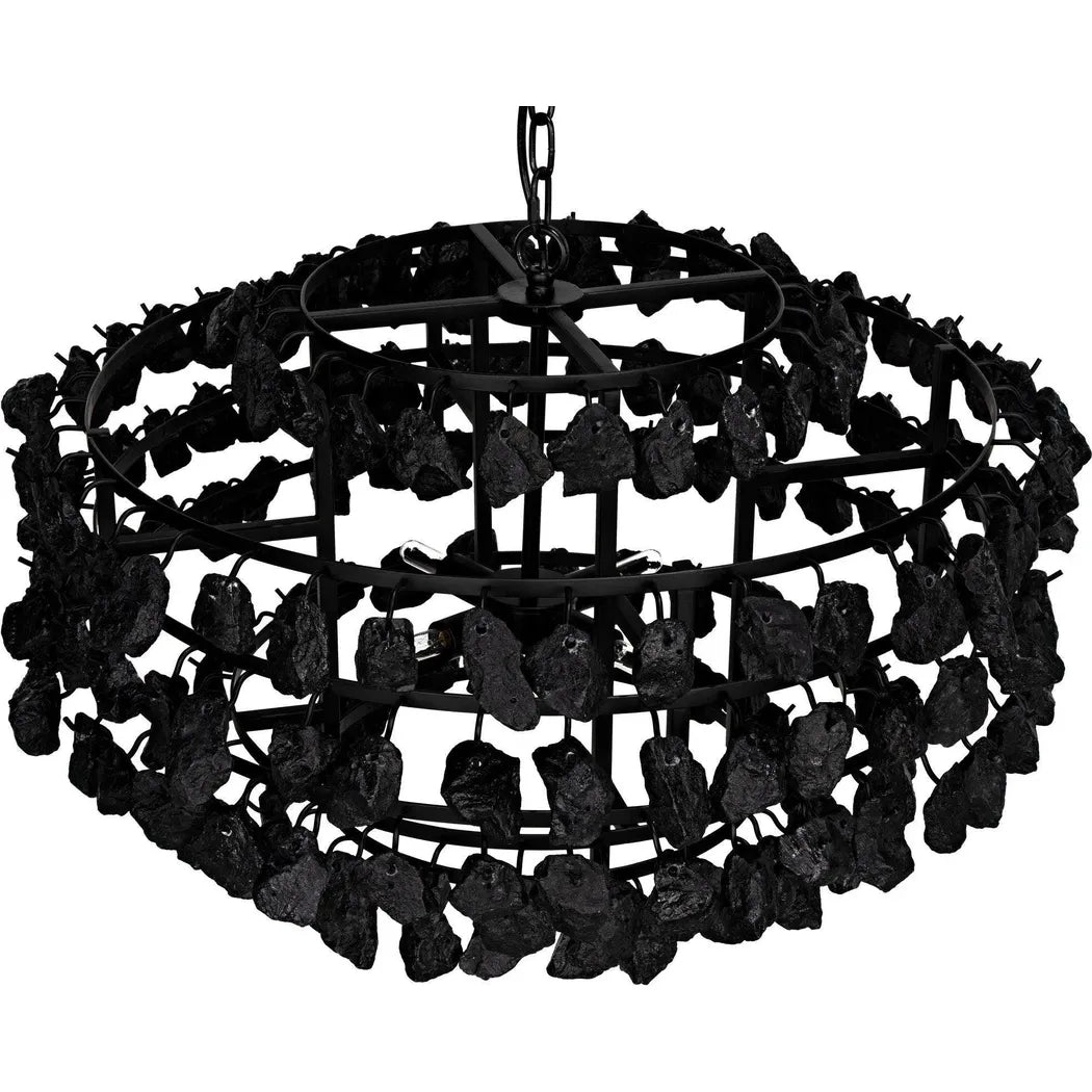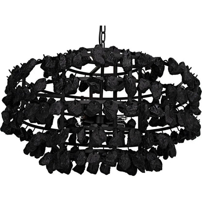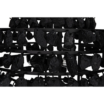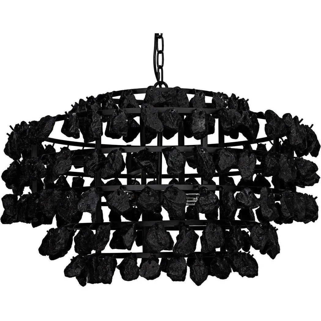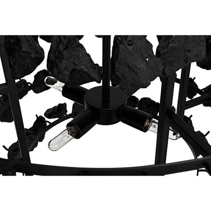 Elevate your home decor with the unique and stylish Vulcan Chandelier. Its matte black glass and rustic rock-like ornaments add a touch of elegance, while the simple matte black finish steel frame provides durability and stability. Crafted to resemble a volcanic event, this chic chandelier is sure to make a statement in any room. A volcanic event turned chic chandelier. Matte black glass is crafted into rustic, rock-like ornaments that adorn a simple matte black finish steel frame. Elevate your home decor with the unique and stylish Vulcan Chandelier.