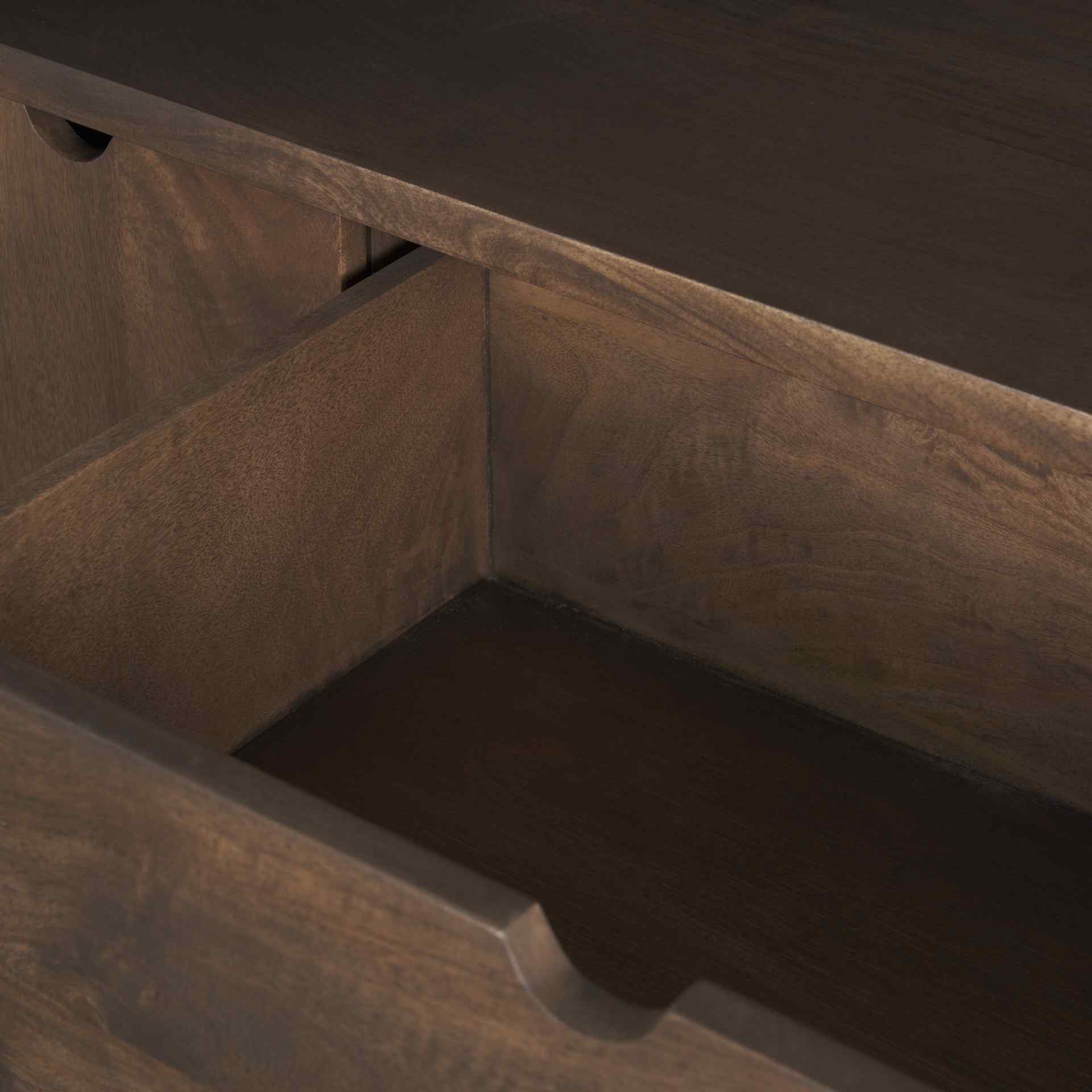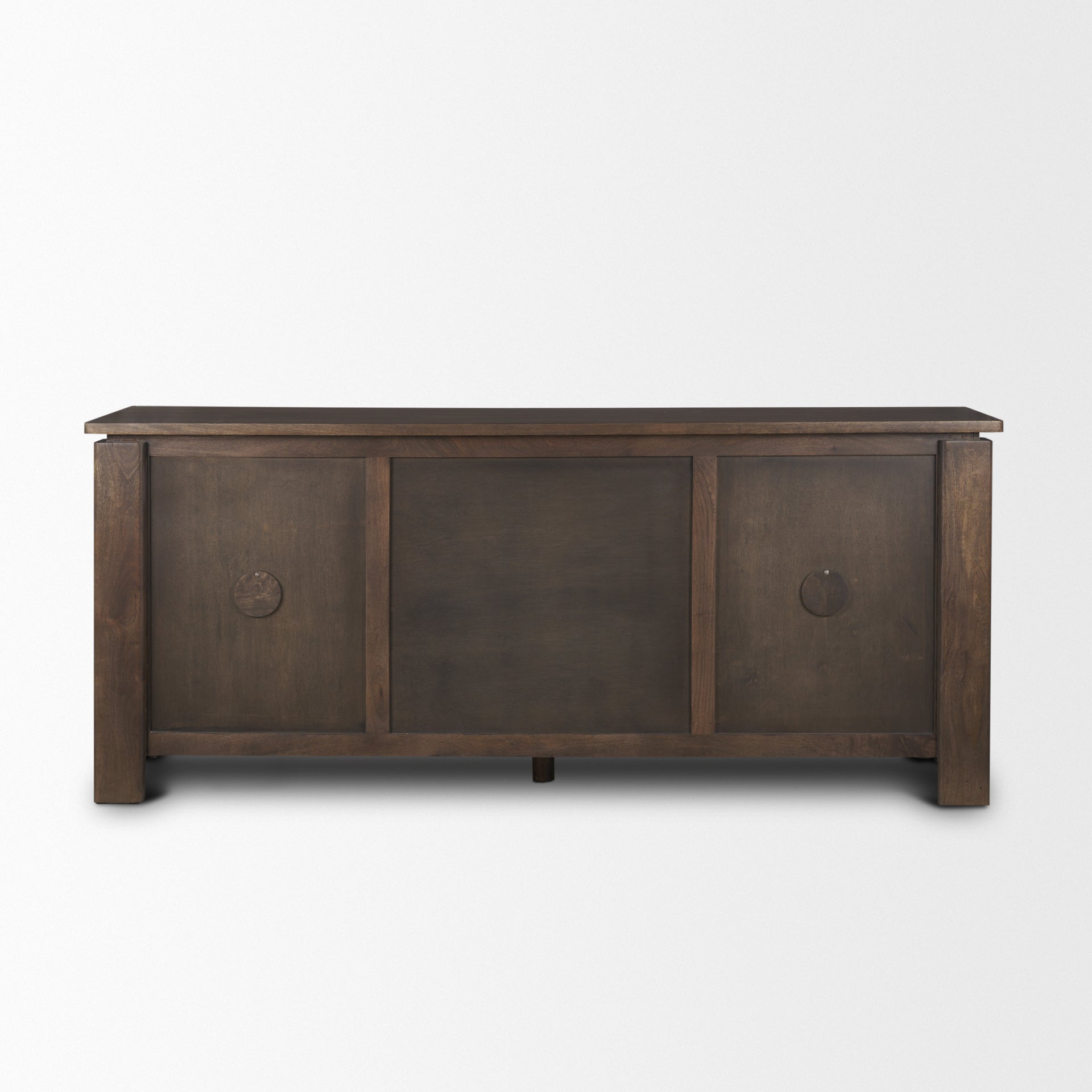The Wallen Sideboard brings a touch of elegance and functionality to any room. Crafted from solid wood, it features a smooth dark brown finish that highlights its sleek, modern design. This sideboard combines the clean lines and roundedecorners of modern furniture with the timeless appeal of classic design. The Wallen Sideboard is not just a piece of furniture; it's a statement of style that fits seamlessly into any home setting.