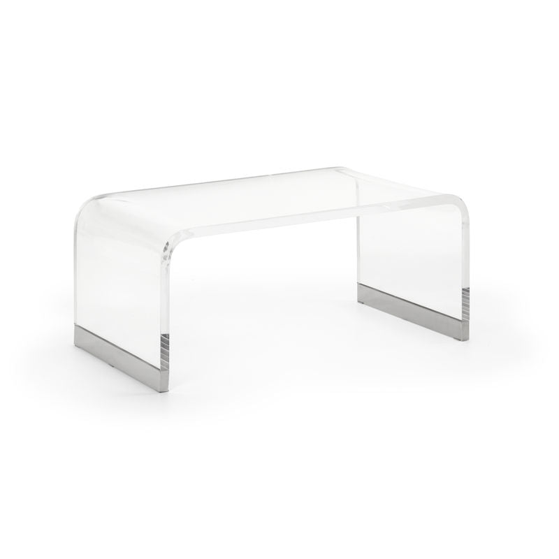 The Waterfall Coffee Table in Nickel is a beautiful addition to any living space. Its clear acrylic structure adds a modern touch that blends seamlessly with various decor styles. The table features a unique waterfall edge, offering a sleek and continuous flow from top to bottom. Nickel-plated caps accentuate the table's edges, enhancing its contemporary appeal. This piece is part of the Chelsea House Misc collection, known for its blend of elegance and practicality. Constructed with a thick 1-1/8" acrylic surface, this coffee table promises durability while maintaining a sense of lightness in your room. Its clear color allows it to complement a wide range of furniture, making it a versatile choice for any setting.