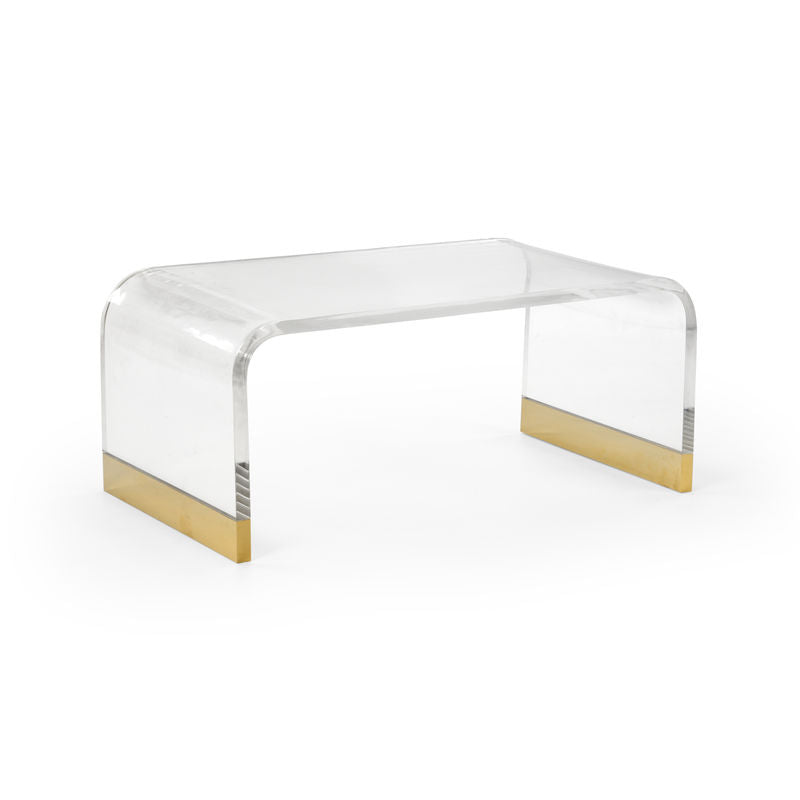 Enhance your living space with a touch of elegance with this stunning coffee table. Made from clear acrylic, its sleek and modern design fits seamlessly into any decor style. The table features a rectangular shape with smooth, rounded edges that ensure safety and comfort. Its standout feature is the waterfall edge, which flows gracefully into antique brass feet, adding a hint of sophistication and luxury. This unique blend of materials and design makes it a versatile piece that complements both contemporary and traditional settings. The clear acrylic construction not only provides a visually light and airy feel but also offers durability and stability. The gold accents at the base add a warm contrast to the cool transparency of the acrylic, creating a balanced look that draws the eye.