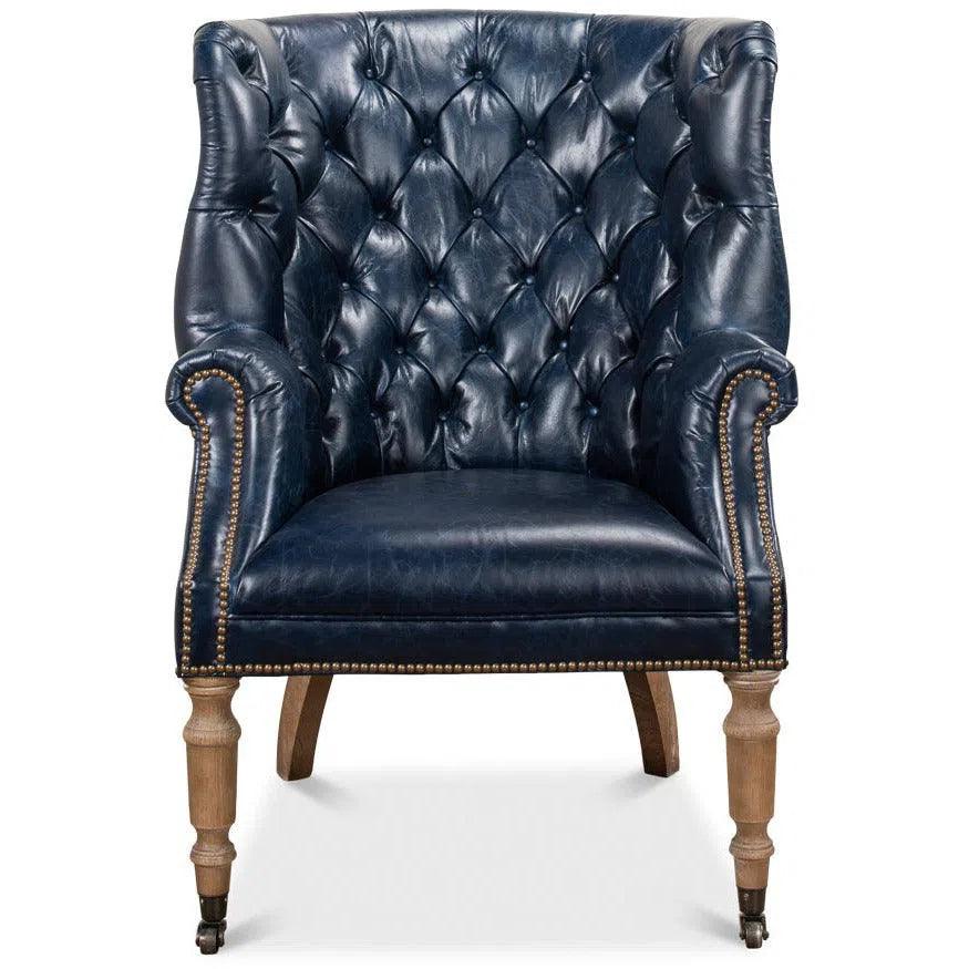 The Welsh Blue Leather Chair is the epitome of luxury and elegance. Made with sumptuous Chateau Blue Leather and supported by Wood, its dimensions make it an inviting seat. The chair boasts traditional design elements, with its backrest and seat cushion offering maximum comfort. Its rich blue hue complements a variety of interior decors, from classic to contemporary, making it a versatile addition to any home or office setting.