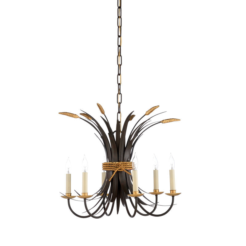 Transform your living space with the Wheat Chandelier, available in both antique gold and bronze finishes. The intricate design features six ivory candle-style bulbs that provide a warm and inviting glow. The antique gold leaf finish or the rustic bronze with gold wheat accents ensures this chandelier complements various interior styles, from traditional to modern. Its timeless structure, featuring wheat spikes wrapped in cord, creates a statement piece for dining rooms, living areas, or entryways, offering both elegance and function. Crafted from durable iron and featuring a six-foot adjustable chain, the Wheat Chandelier is customizable to suit your ceiling height. Its design includes twisted rope details and chain suspension for easy installation, while the soft light from the ivory candles creates a cozy and upscale ambiance.