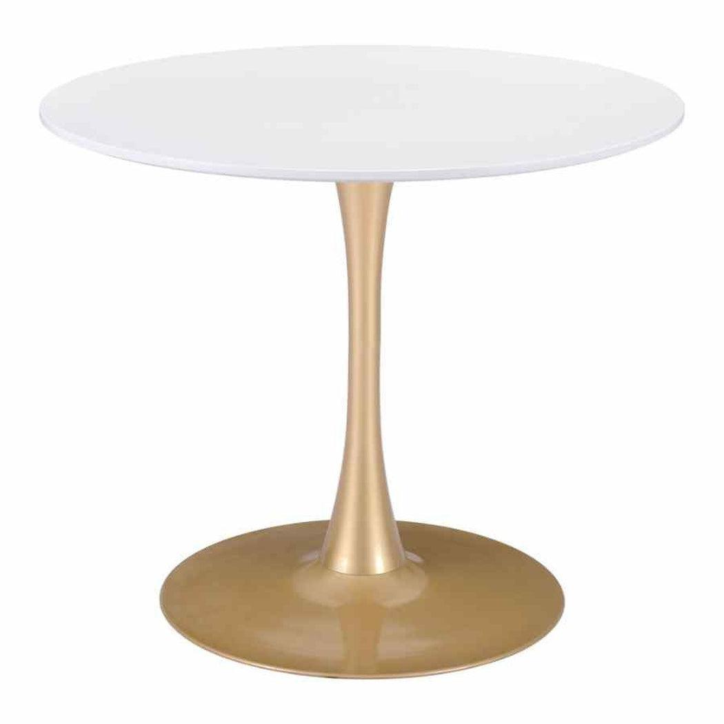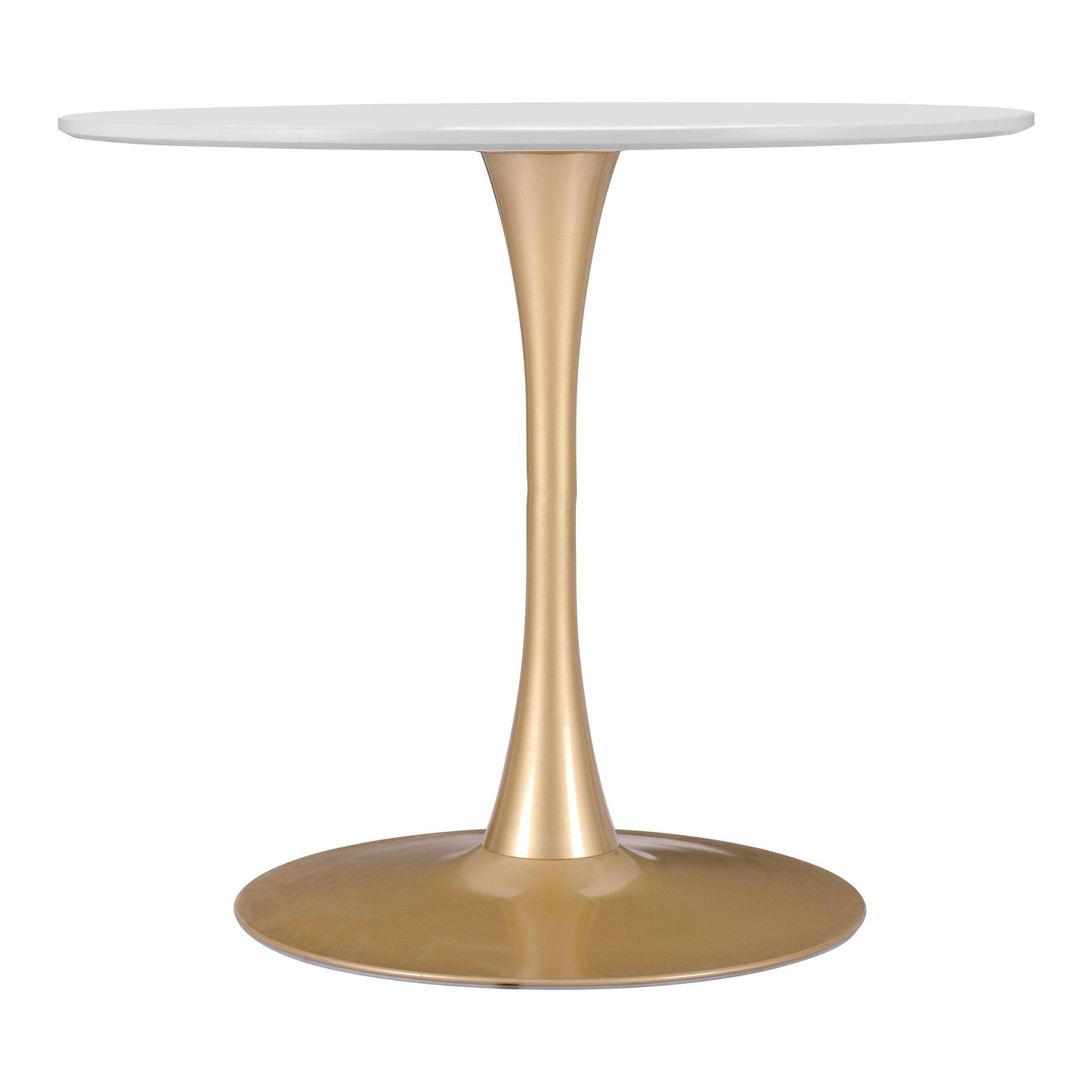 Transform any space into a stylish oasis with the Opus Dining Table White Gold. Its sleek disc design on a pedestal base creates a floating effect, making it a striking centerpiece for kitchens, living rooms, offices, or bars. Crafted from durable steel and MDF with a painted, powder-coated finish, this table supports up to 175 lbs. Assembly is simple with tools provided, so elevate your space with confidence.