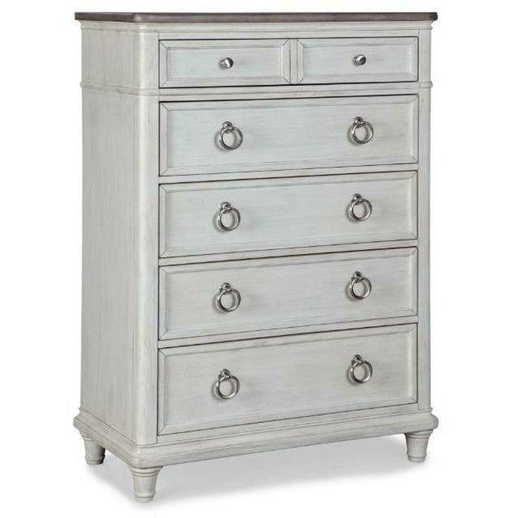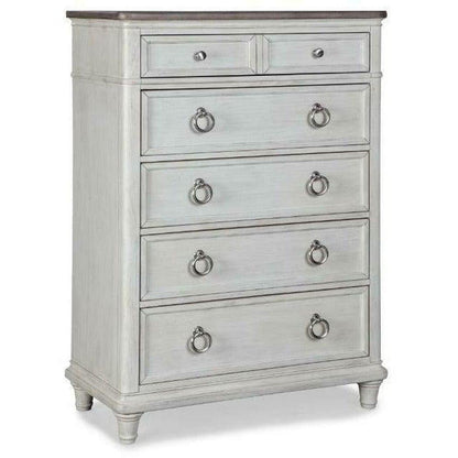 The popular wire brushed grey and antique weathered white two-tone finish adds a touch of refinement to this laid-back lifestyle. True to cottage/bungalow design, this collection boasts soft rounded corners, simple molded doors and drawers, and tapered turned feet, making it a versatile addition to any environment. The sophisticated two-tone finish of the White Two-Tone Wooden Drawer Chest, combined with its classic cottage design elements, such as rounded corners, molded doors and drawers, and tapered turned feet, creates a look that is timeless yet modern.