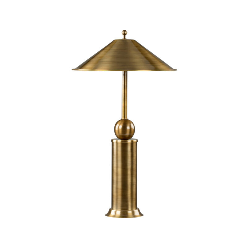 The Winbury Lamp combines modern style with a touch of vintage appeal. Crafted from brass with a charming antiqued finish, it showcases a sleek cylindrical base paired with a spherical accent. This design not only offers a sturdy foundation but also adds a minimalist touch to your space. The brass shade is wide and flared, ensuring a warm and focused light, making it a perfect addition to your desk, reading corner, or bedside table. This lamp features a timeless brass finish, blending seamlessly into both classic and modern interiors. Its elegant profile and contemporary silhouette bring a luxurious yet understated charm to any room.