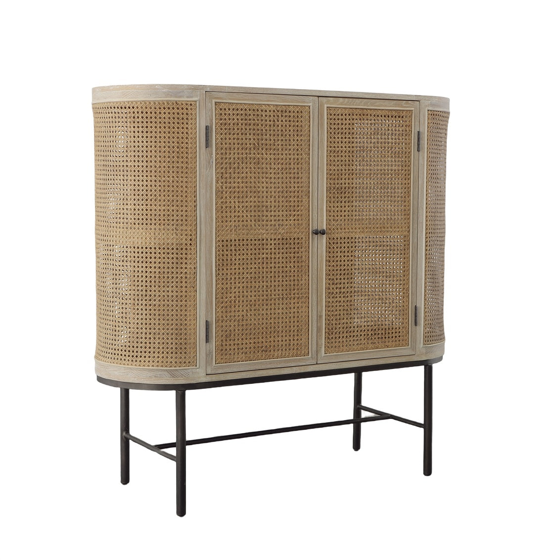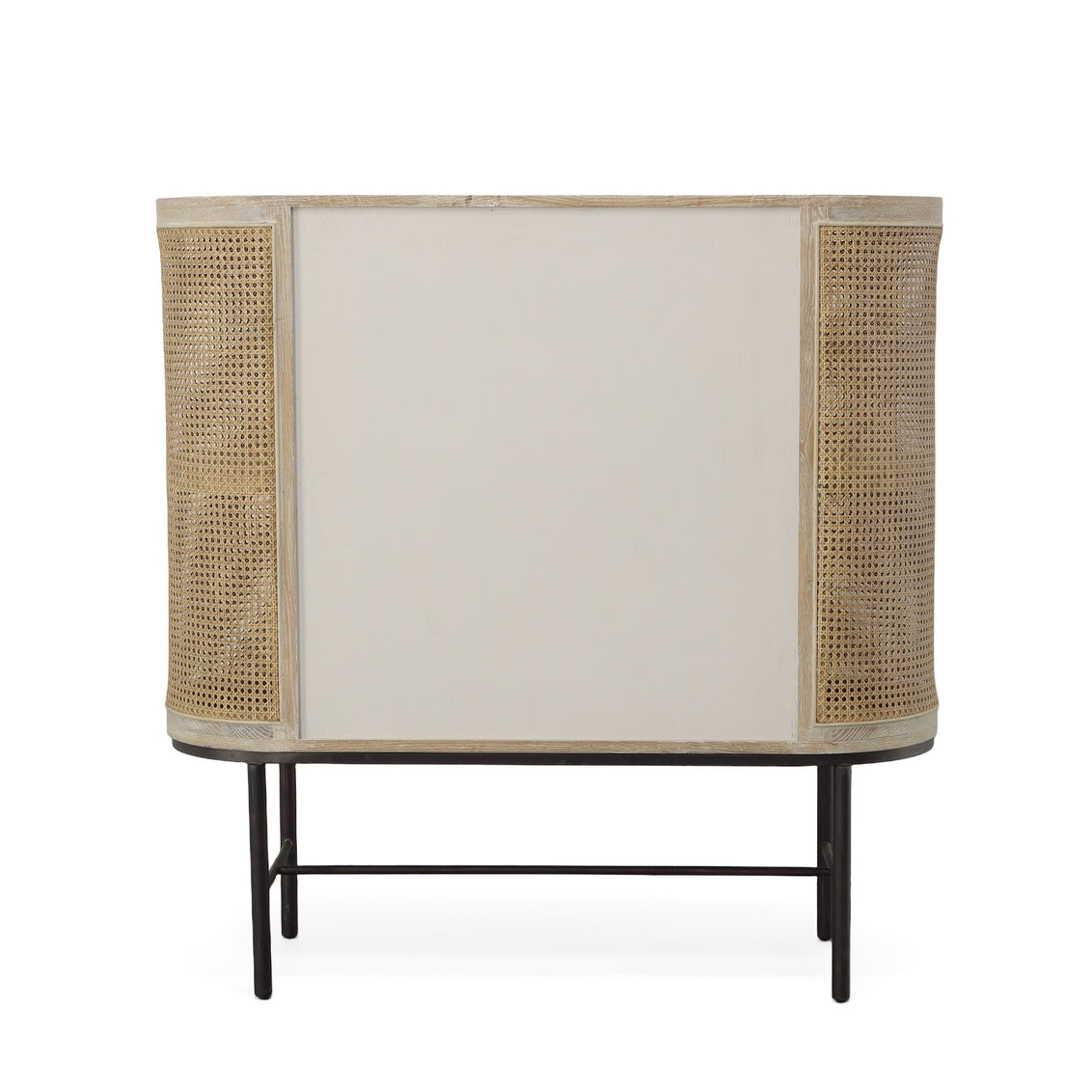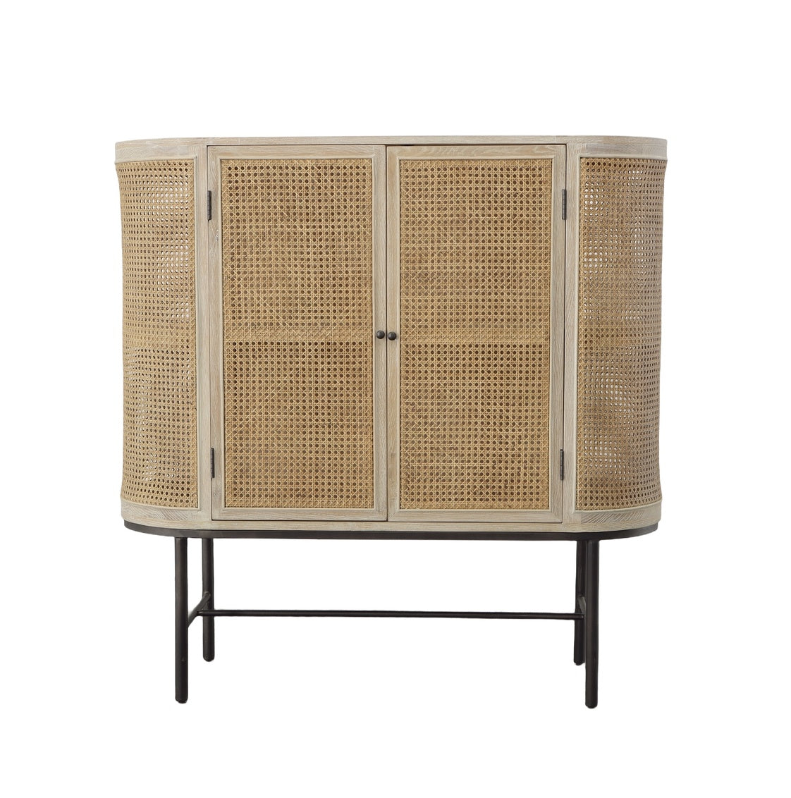 Crafted from oak with delicate woven detailing, this piece exudes a feeling of lightness and freedom. Elevated by slim metal legs, it's a perfect fit for any space. Inside, you'll find a shelf ready for organizing your favorite beverages and glassware. It's a stylish and functional addition to any home!