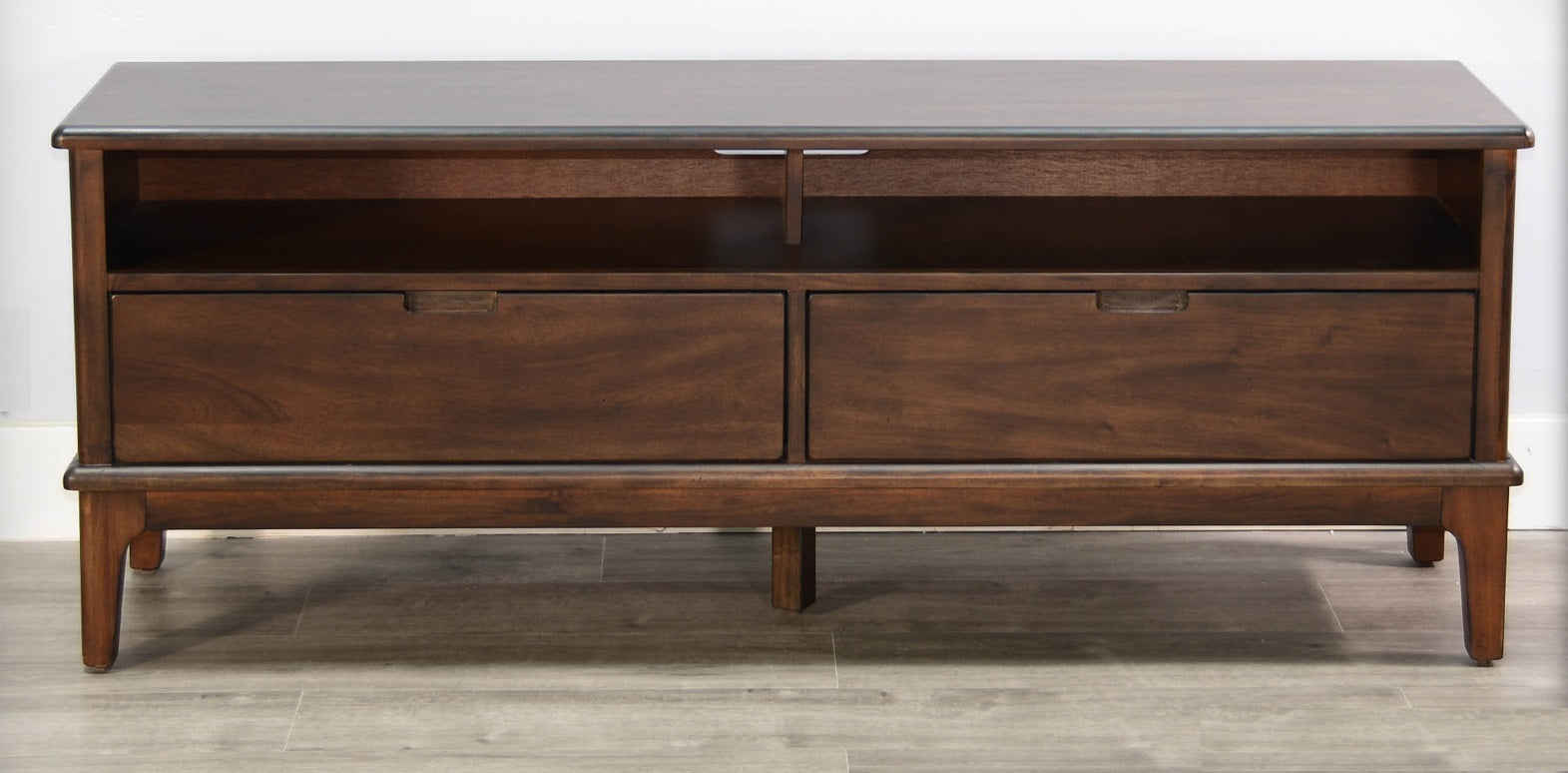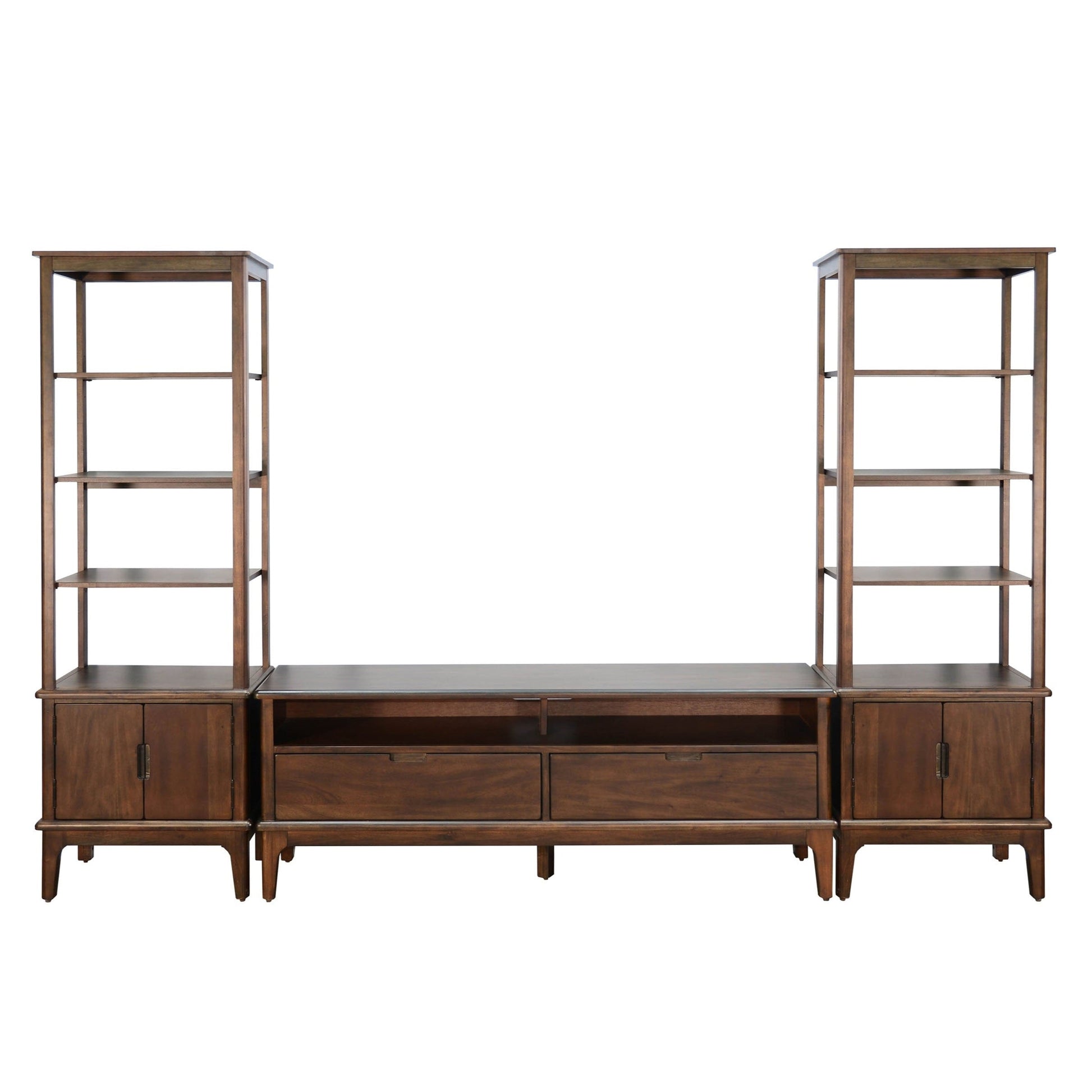 This Windmere Mid-Century Modern TV Stand combines clean lines with warm wood tones to enhance any living room. Its rich brown finish and mahogany construction provide a durable and stylish base. The TV stand features open shelving for easy access to media components and two deep drawers for hidden storage of remotes and accessories. Matching pier cabinets offer adjustable shelves for displaying items while maintaining a sleek look. Tapered legs and minimalist hardware add to its mid-century charm, making it a versatile piece that pairs well with both classic and contemporary décor.