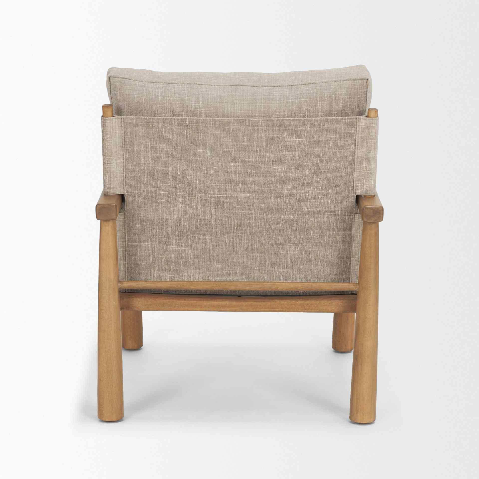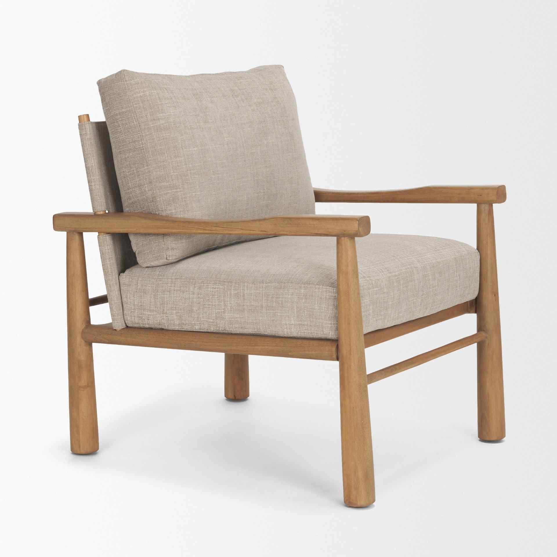 The Witton Lounge Chair combines comfort and style with a refined lodge look. It features a light brown wood frame and is upholstered in a soft gray fabric. The slingback backrest offers a unique design that adds both flair and comfort to any room. It's perfect for adding a touch of sophistication to living rooms, bedrooms, or foyers. The sturdy tapered legs ensure durability, while the cushioned seat makes it a great spot to relax. This chair is crafted from quality materials, blending solid wood with fabric for a textural contrast that enhances any interior space.
